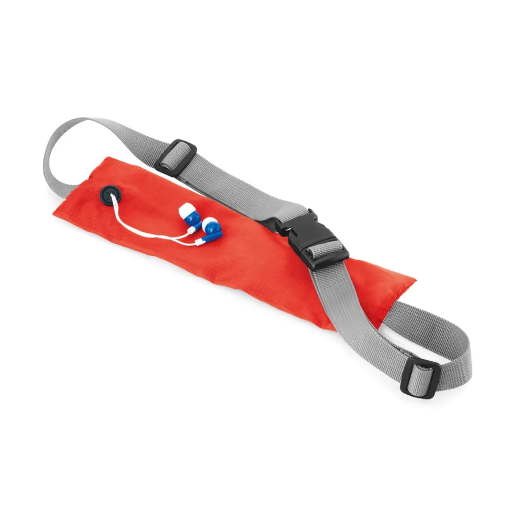 Pochete em 210D ripstop com saída para fone de ouvido. Bolsa com zíper e alça ajustável