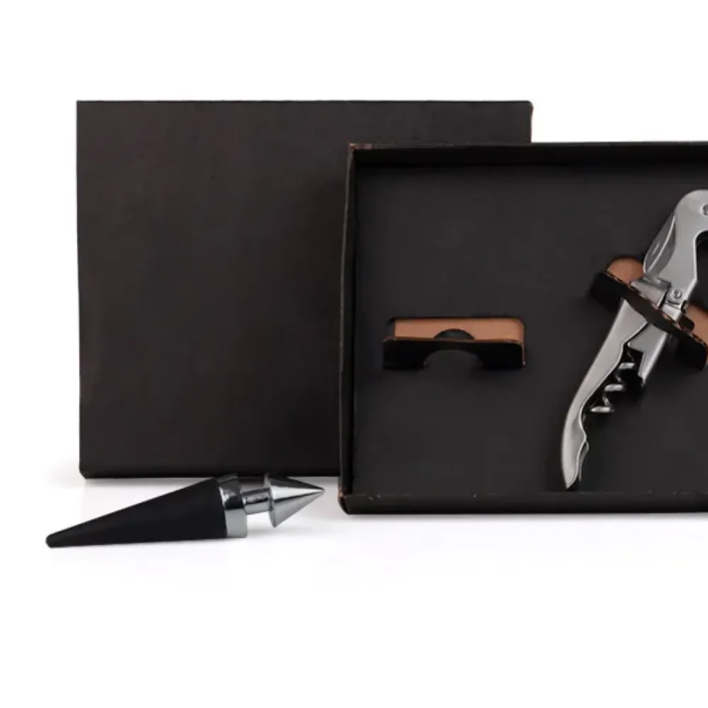 Abridor saca-rolhas e tampão em aço inox. Abridor conta com agulha espiral saca-rolhas, uma lâmina canivete de 1” com serra para cortar lacres e abridor de garrafas com duas bases de apoio. Tipo de gravação: Uma gravação a Laser no abridor. Dimensões do produto: Abridor: 12x2,2x1,2cm Dimensões da embalagem: 165x135x20 mm (AxLxP) Peso da embalagem: 110 g Embalagem do produto: Caixa Preta