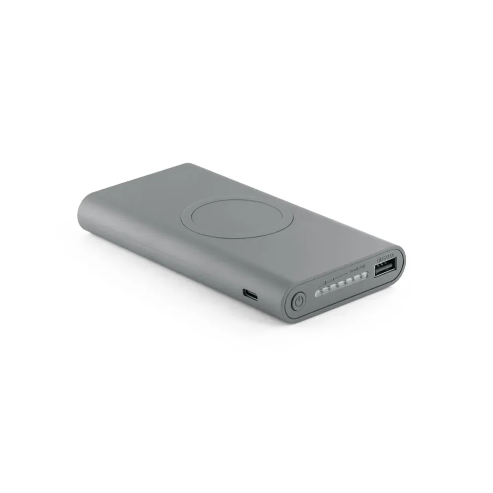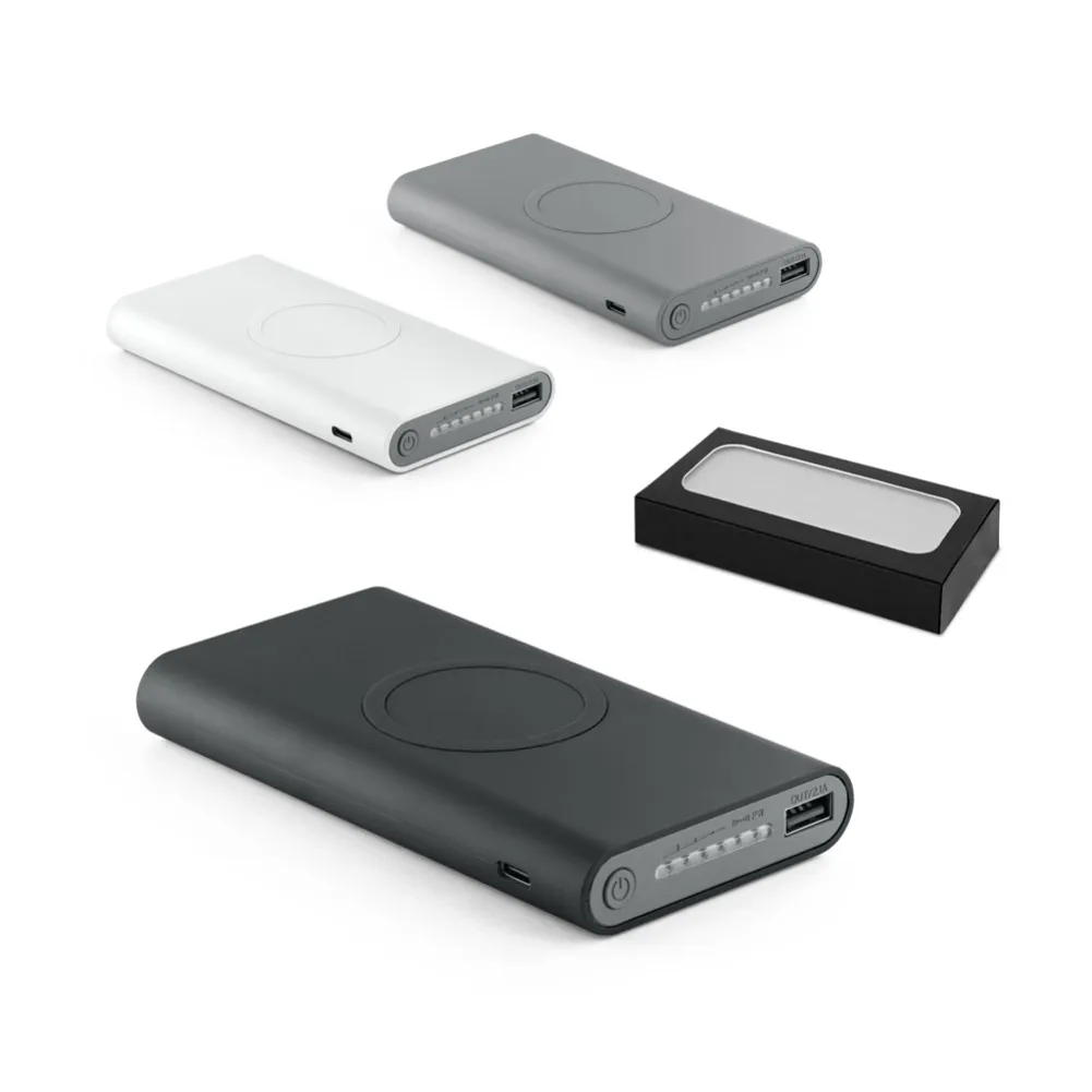 Bateria portátil em ABS com acabamento emborrachado que permite o carregamento do dispositivo por indução. Bateria de lítio com capacidade de 10000 mAh e tempo de vida ≥ 500 ciclos. Com entrada/saída 5V/21A e potência de carregamento de 5W. Indicador de carga e portas USB, micro USB e USB tipo C. Incluso cabo USB / micro USB para carregar a bateria. Compatível com smartphones com tecnologia de carregamento sem fios. Fornecida em caixa presente. 135 x 75 x 20 mm | Caixa: 150 x 95 x 25 mm