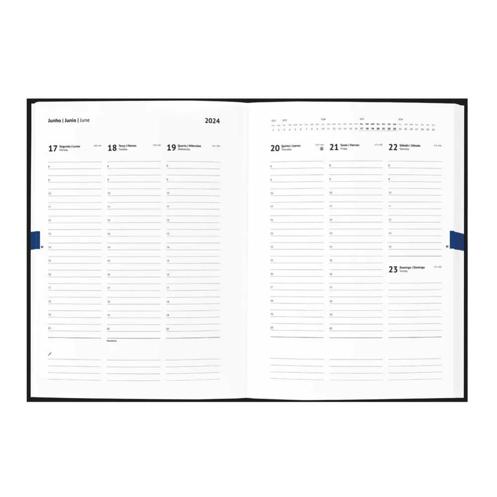 Agenda B5 em PU com marcador em fita. Está organizada num plano semanal. 175 x 245 mm