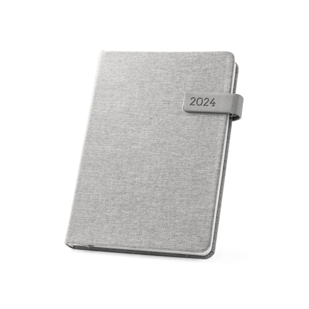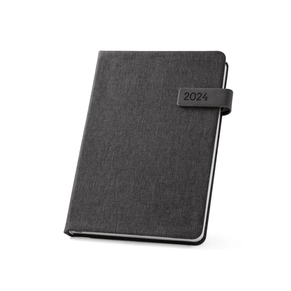 Agenda A5 em rPET com fecho magnético em PU, marcador em fita e suporte para esferográfica (não incluída). Está organizada num plano diário. Fornecida com bolsa de non-woven. 148 x 210 mm | Bolsa: 205 x 250 mm