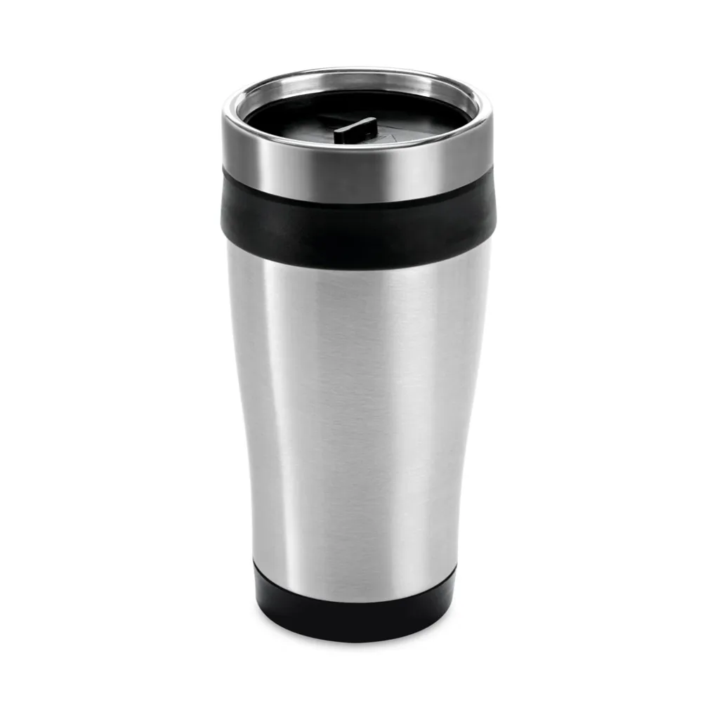 Copo de viagem em aço inox e PP com corpo duplo (térmico). Tampa com sistema de abertura e fecho fácil. Capacidade até 420 mL. Preserva as bebidas quentes por 2h e frias por 4h. Certificação EU Food Grade. Fornecida em caixa. ø81 x 187 mm