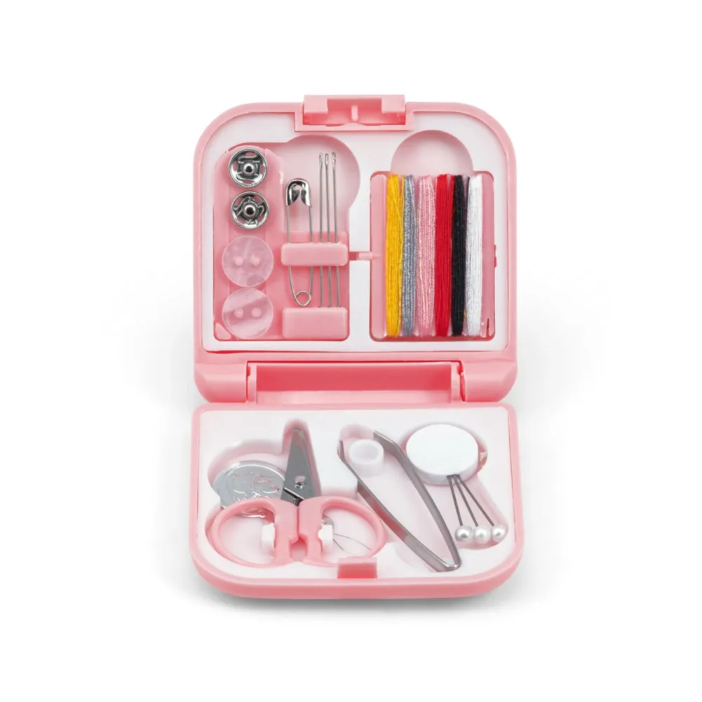 Kit de costura prático e leve para levar em viagem. Composto por 3 alfinetes, 3 agulhas, 1 pinça, 1 tesoura, 1 enfia linha, 1 alfinete, 2 botões, 2 colchetes e 6 rolos de linhas de várias cores. Fornecido em estojo. 70 x 21 x 65 mm