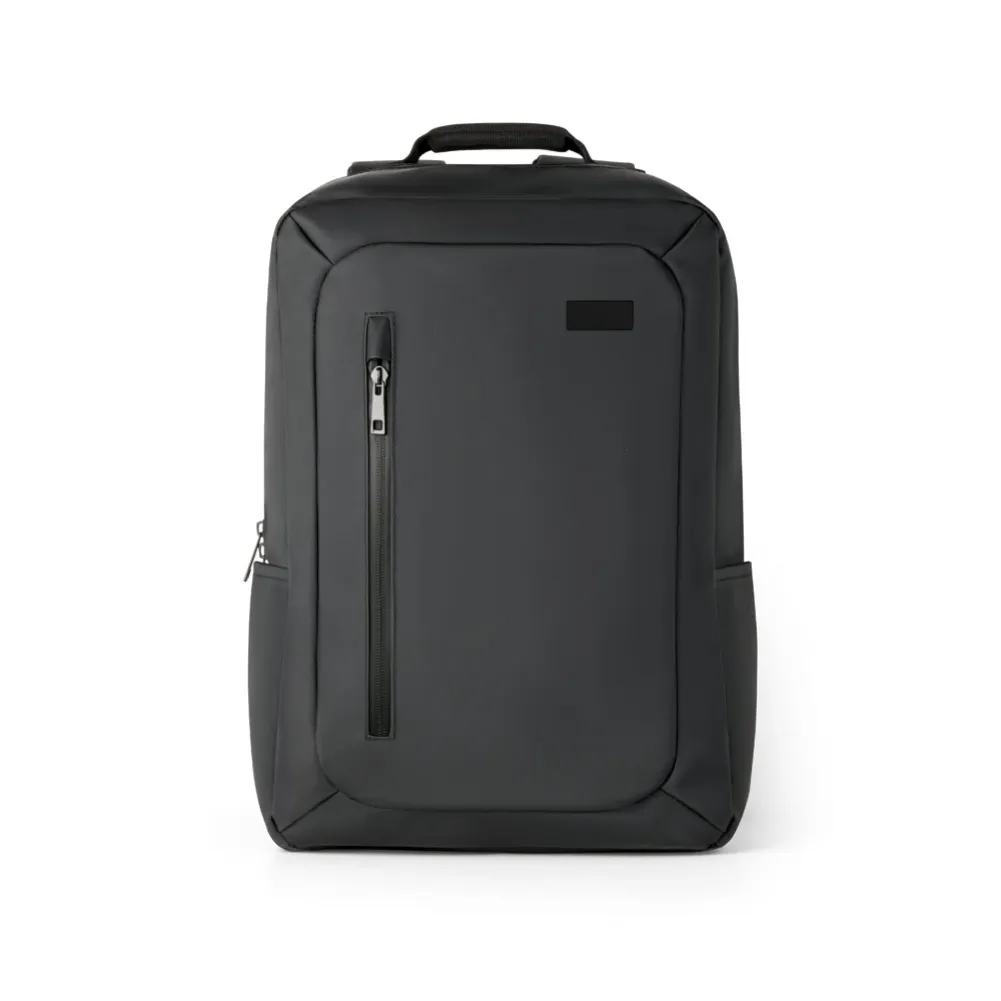 Mochila para notebook em poliéster 600D impermeável com compartimento principal almofadado para notebook até 156. Bolso frontal e zípers impermeáveis. Bolso lateral em tela e parte posterior almofadada, com sistema de apoio acolchoado para as costas e alças almofadadas. Placa metálica removível com imã, para fácil gravação. 280 x 400 x 110 mm