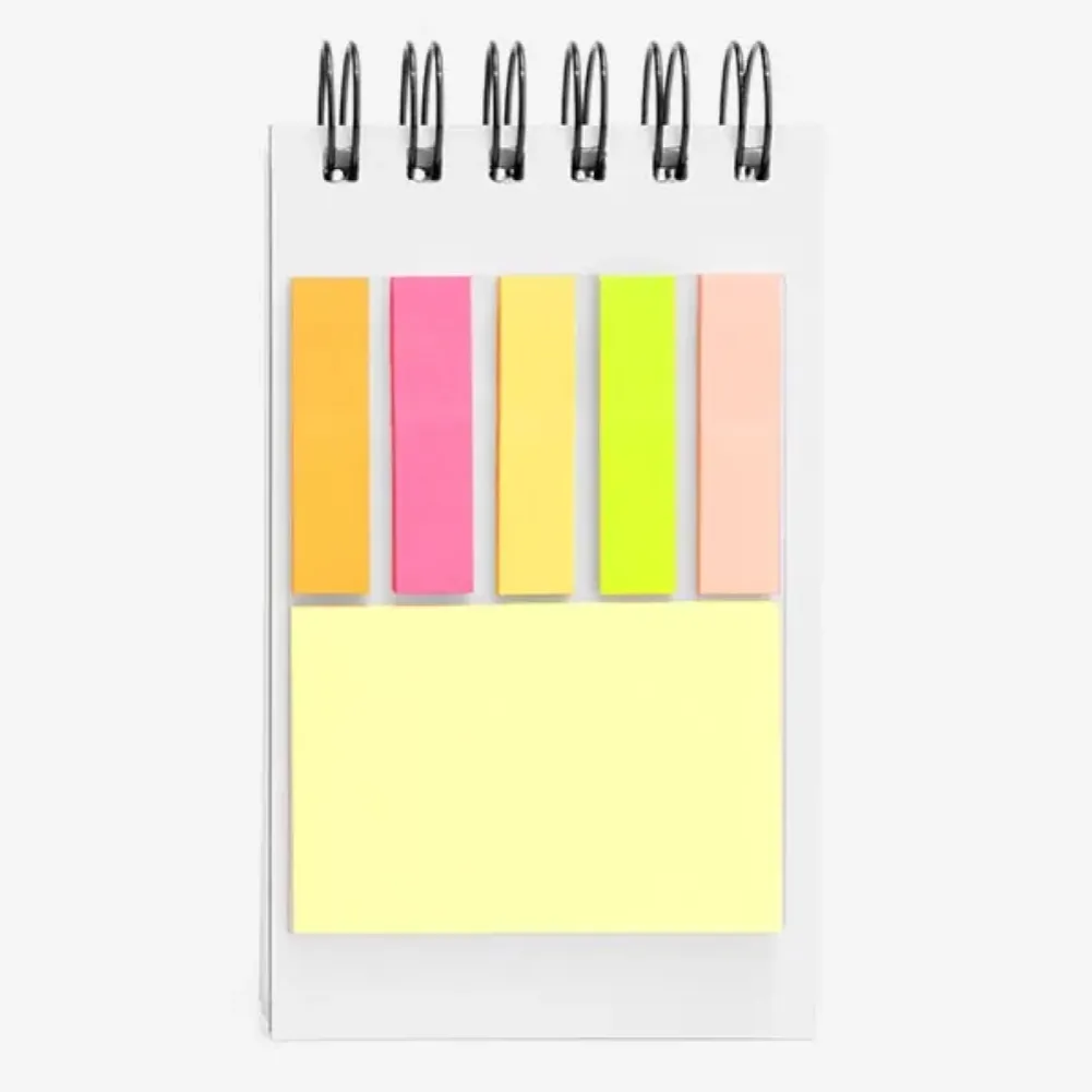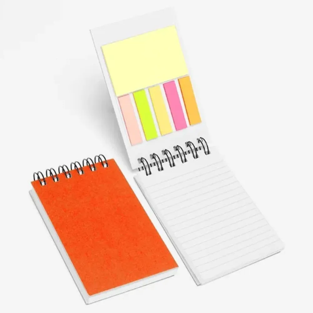 Caderno para anotações laranja com capa dura. Conta com 100 folhas pautadas com fechamento wire-o e 5 cores com 25 folhas autocolantes. Tipo de gravação: Uma gravação em Silkscreen na capa. Dimensões do produto: 15x8,5cm Dimensões da embalagem: 150x85x20 mm (AxLxP) Peso da embalagem: 132 g Embalagem do produto: Caixa Preta