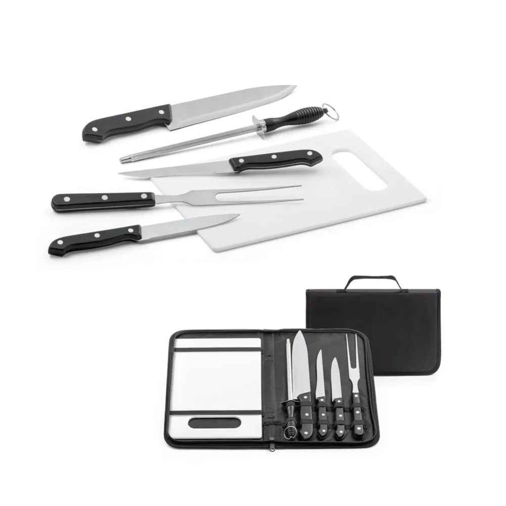 Kit churrasco em estojo de nylon 210D. Composto por tábua em PP e 5 utensílios em aço inox e PP: faca chefe, faca boning, faca pequena, garfo e afiador. Próprio para contato com alimento. Estojo: 350 x 230 x 40 mm | Tábua: 283 x 192 x 5 mm