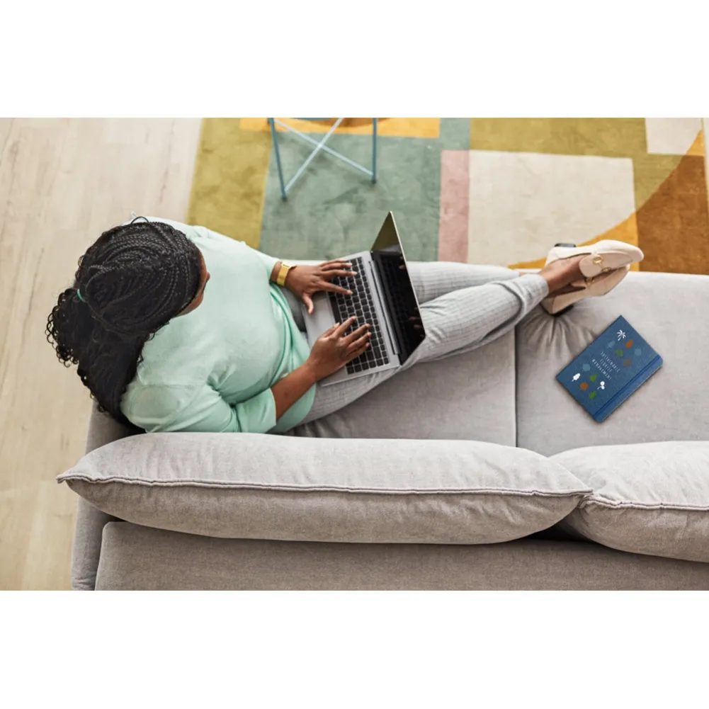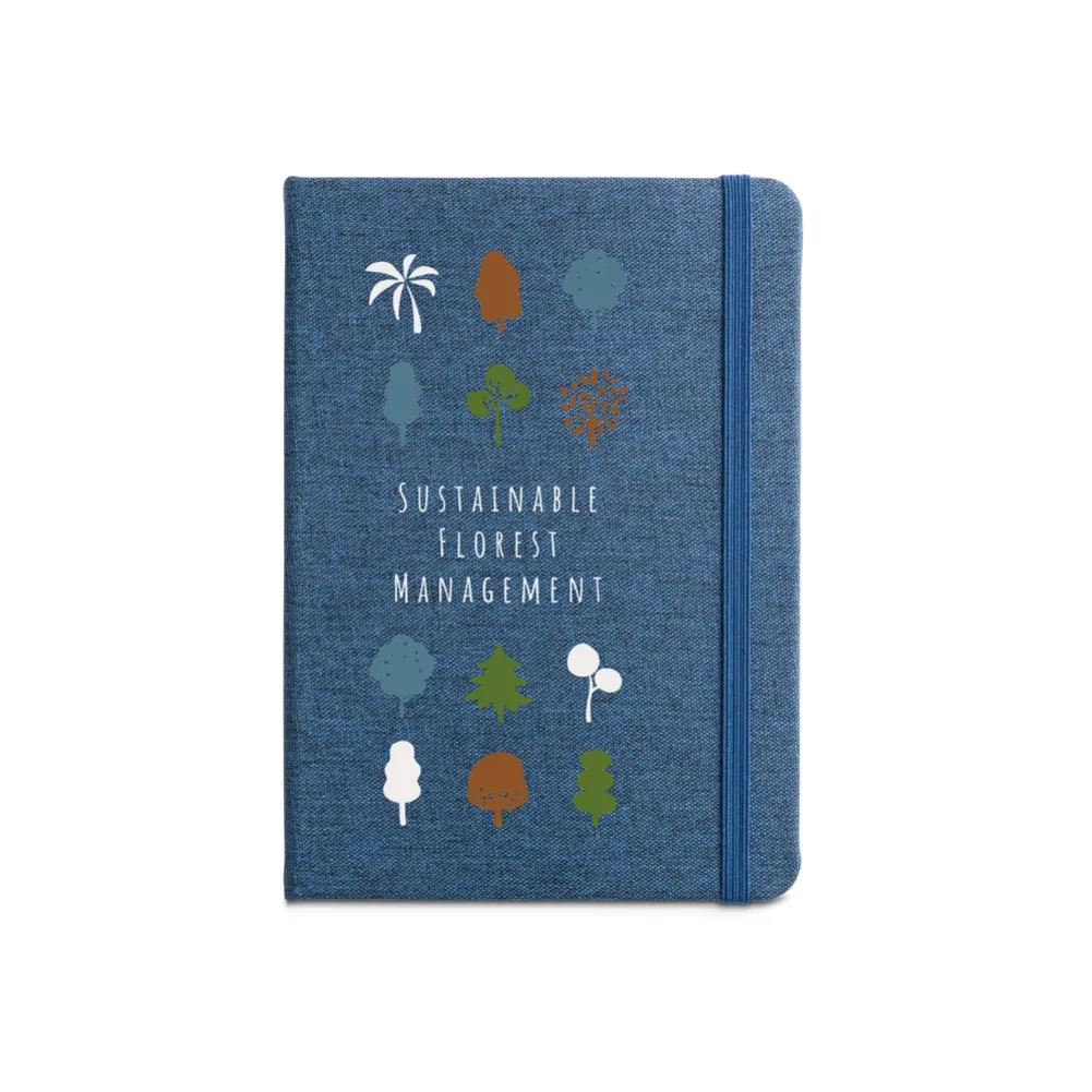 Caderno A5 com capa dura em rPET. Contém 96 folhas pautadas em papel cor marfim proveniente de gestão florestal sustentável, fita separadora, elástico e bolso em papel na parte traseira da capa. 140 x 210 mm
