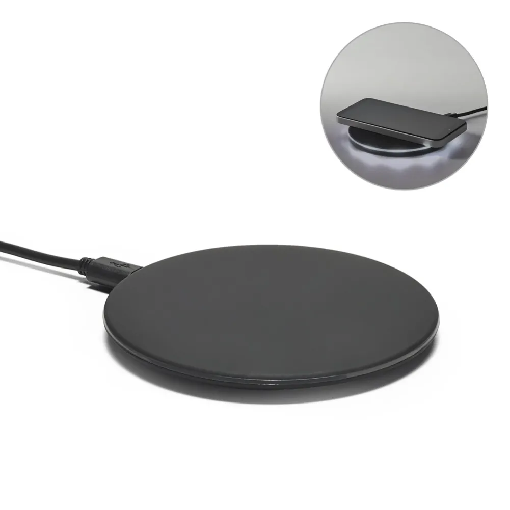 Carregador wireless rápido em ABS com acabamento emborrachado. Entradas 5V/2A e 9V/1.67A. Potência máxima de carregamento de 10W. Incluso cabo USB / micro USB de 1 m para carregar. Compatível com smartphones com tecnologia de carregamento sem fios. Fornecido em caixa presente. ø99 x 9 mm | Cabo: 1000 mm