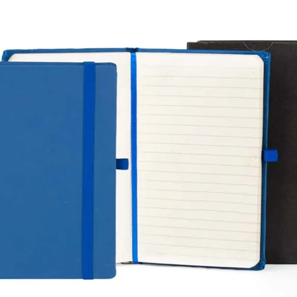 Caderno para anotações azul com capa dura. Conta com 80 folhas pautadas, marcador de página, porta caneta e elástico para fechamento. Gramatura da folha de 70 g/m2. Tipo de gravação: Uma gravação em Silkscreen na capa. Dimensões do produto: 12,2x17 cm Dimensões da embalagem: 127x177x15 mm (AxLxP) Peso da embalagem: 224 g Embalagem do produto: Caixa Preta