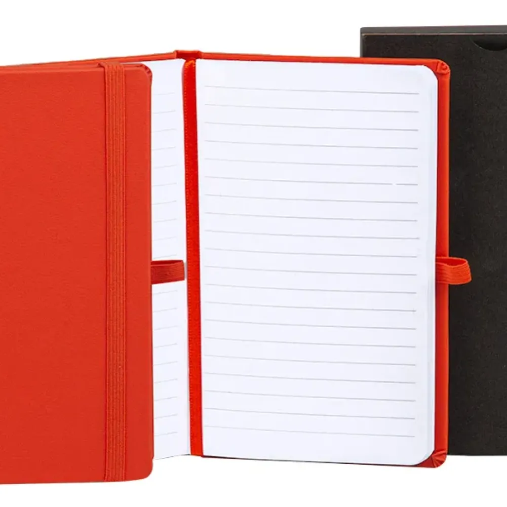 Caderno para anotações laranja com capa dura. Conta com 80 folhas pautadas, marcador de página, porta caneta e elástico para fechamento. Gramatura da folha de 70 g/m2. Tipo de gravação: Uma gravação em Silkscreen na capa. Dimensões do produto: 9,5x15,5 cm Dimensões da embalagem: 105x150x15 mm (AxLxP) Peso da embalagem: 150 g Embalagem do produto: Caixa Preta
