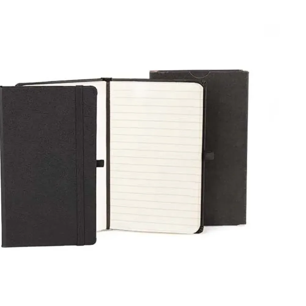 Caderno para anotações preto com capa dura. Conta com 80 folhas pautadas, marcador de página, porta caneta e elástico para fechamento. Gramatura da folha de 70 g/m2. Tipo de gravação: Uma gravação em Silkscreen na capa. Dimensões do produto: 9,5x15,5 cm Dimensões da embalagem: 105x150x15 mm (AxLxP) Peso da embalagem: 150 g Embalagem do produto: Caixa Preta