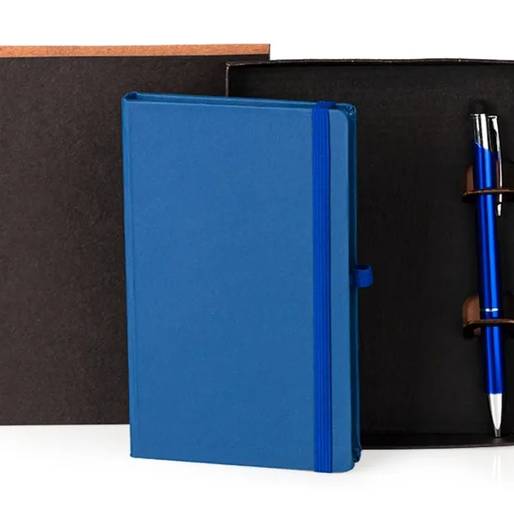 Caderneta para anotações com caneta. A caderneta conta com 80 folhas não pautadas, suporte para caneta e elástico para fechamento. Caneta em alumínio, carga esferográfica azul e ponta touch para smartphones e tablets. Tipo de gravação: Uma gravação em Silkscreen na capa e na caneta. Dimensões do produto: Caderno: 9,5x15,5 cm / Caneta: 14,2x0,8cm Dimensões da embalagem: 135x165x20 mm (AxLxP) Peso da embalagem: 188 g Embalagem do produto: Caixa Preta