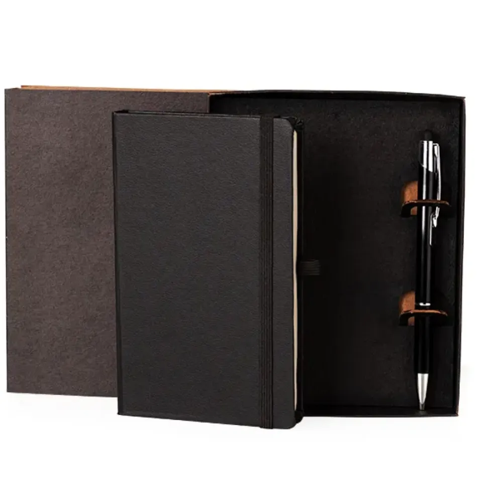 Caderneta para anotações com caneta. A caderneta conta com 80 folhas não pautadas, suporte para caneta e elástico para fechamento. Caneta em alumínio, carga esferográfica azul e ponta touch para smartphones e tablets. Tipo de gravação: Uma gravação em Silkscreen na capa e na caneta. Dimensões do produto: Caderno: 9,5x15,5 cm / Caneta: 14,2x0,8cm Dimensões da embalagem: 135x165x135 mm (AxLxP) Peso da embalagem: 188 g Embalagem do produto: Caixa Preta