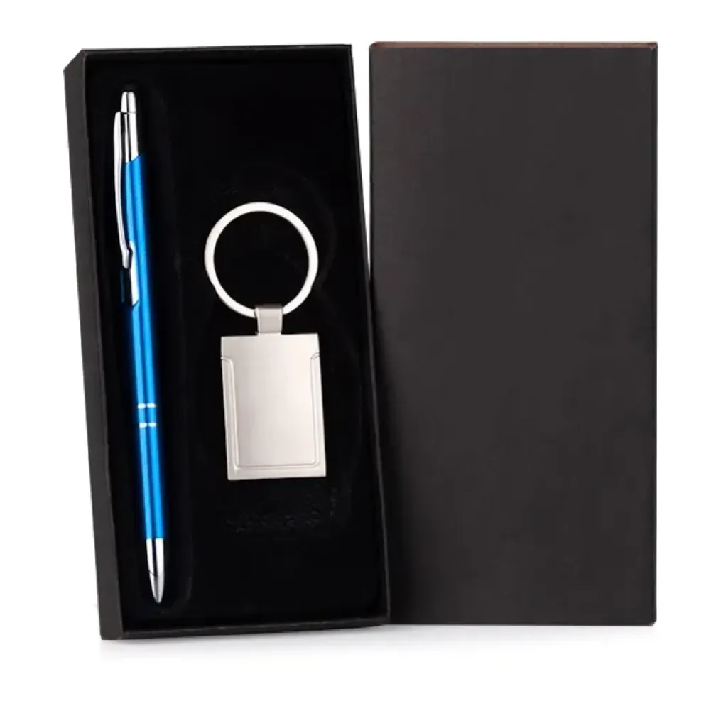 Caneta esferográfica em alumínio azul com acabamento cromado, clipe em metal e ponteira touch em silicone preto. Conta também com chaveiro em metal injetado em liga de Zamac, com acabamento cromado fosco, detalhes e argola em cromado brilhante. Tipo de gravação: Uma gravação a Laser na caneta e chaveiro. Dimensões do produto: Caneta: 14,2x0,8cm; Chaveiro: 7,5x2,8x0,4cm Dimensões da embalagem: 160x80x25 mm (AxLxP) Peso da embalagem: 80 g Embalagem do produto: Caixa preta