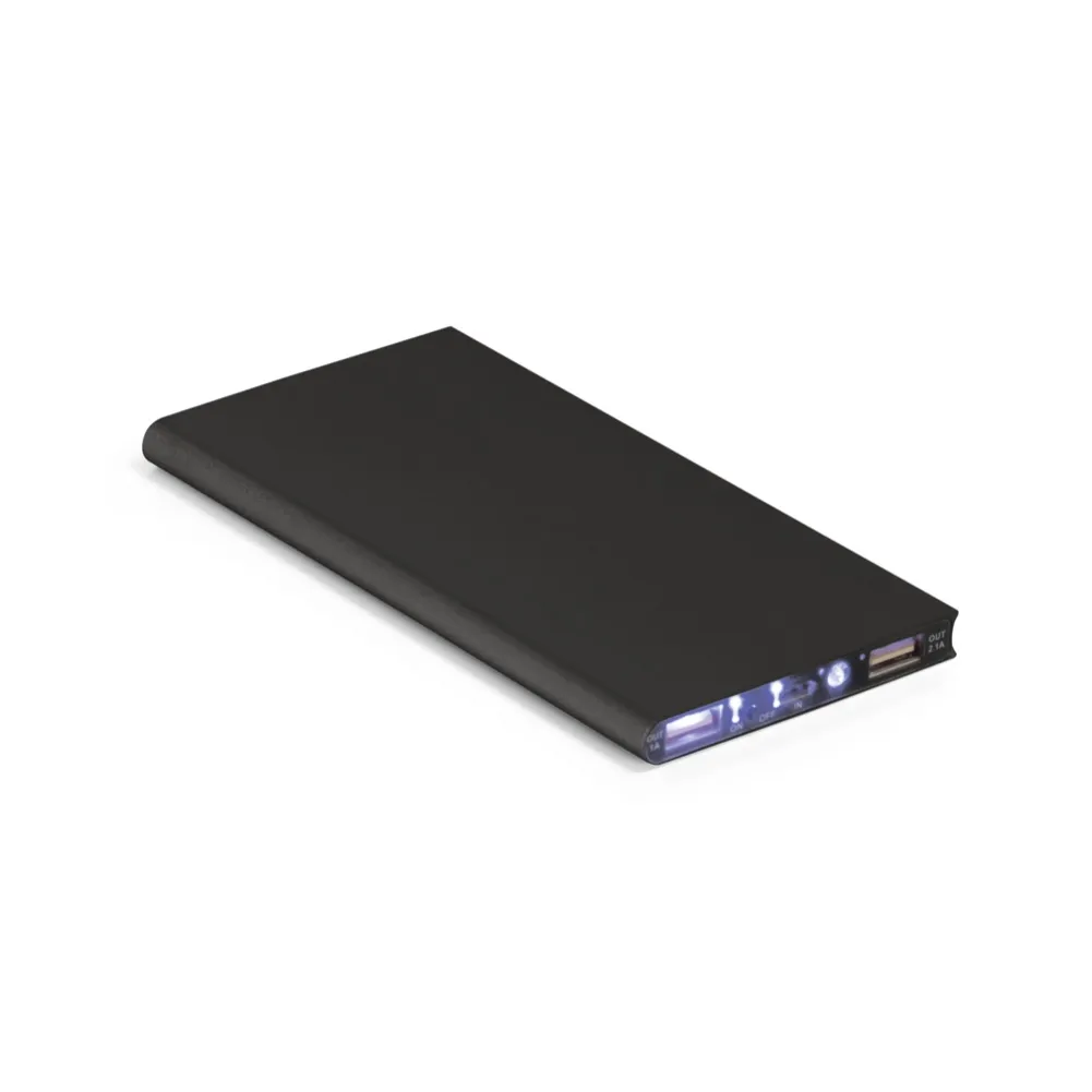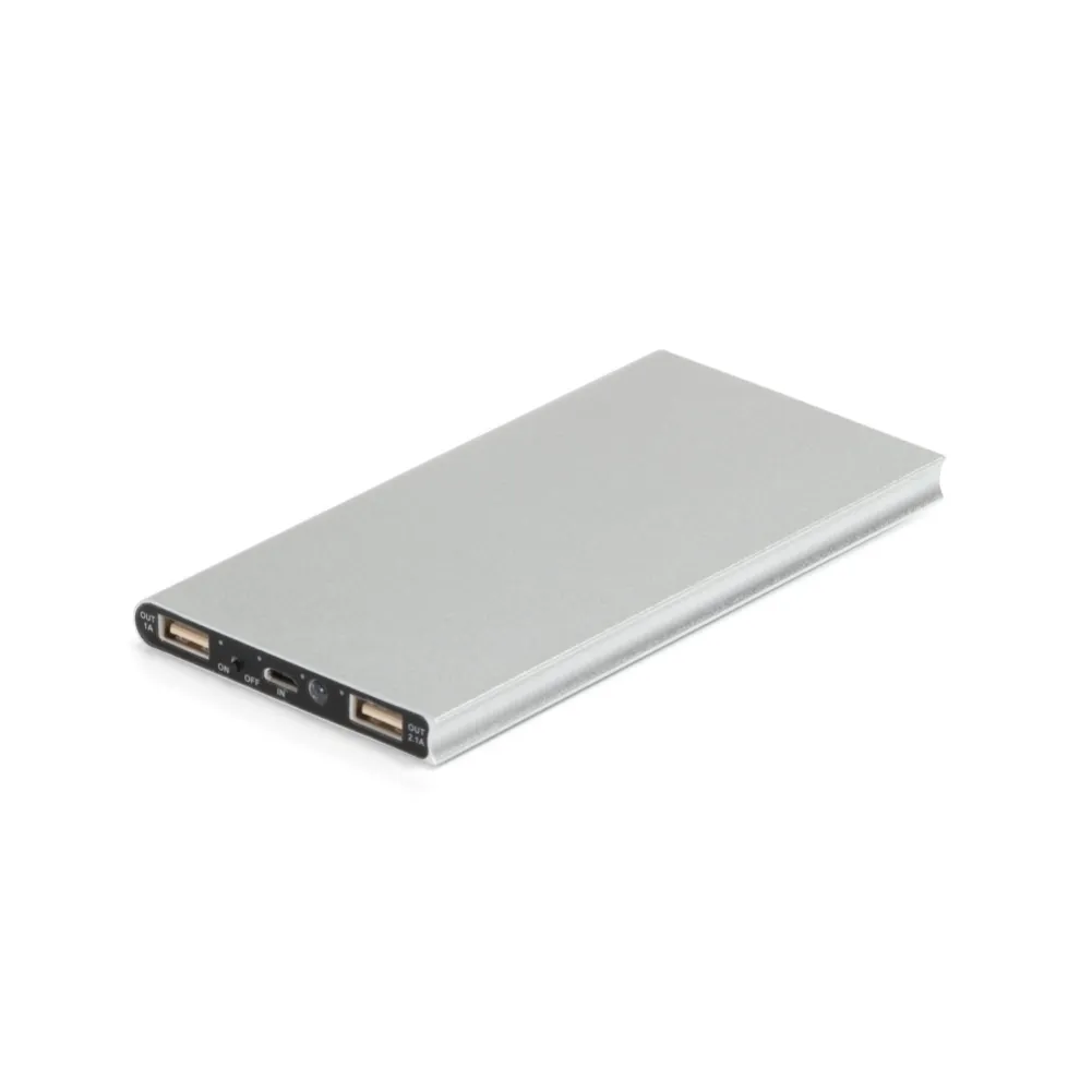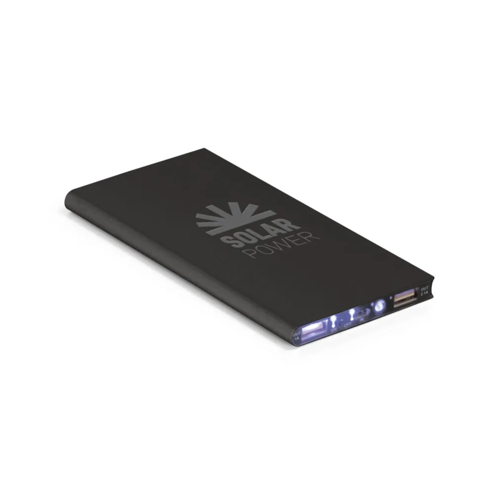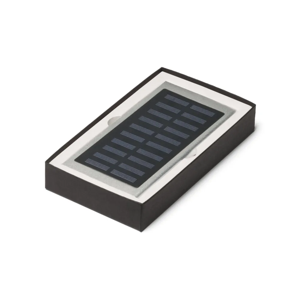 Bateria portátil em alumínio com painel solar e LED. Bateria de lítio com capacidade de 8000 mAh e tempo de vida ≥ 500 ciclos. Com entrada 5V/1A, saída 5V/1-21A e 2 portas USB. Incluso cabo USB / micro USB para carregar a bateria. Fornecida em caixa presente. 155 x 75 x 10 mm | Caixa: 175 x 100 x 30 mm
