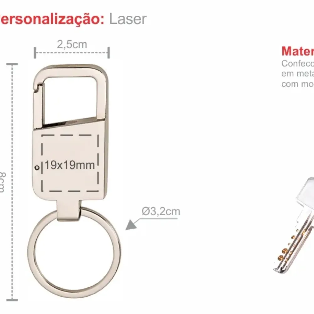 Chaveiro em Metal cromado com mosquetão. Tipo de gravação: Uma gravação a Laser (clara) em um lado do chaveiro. Dimensões do produto: Chaveiro: 8x2,5x0,6cm Dimensões da embalagem: 80x25x6 mm (AxLxP) Peso da embalagem: 30 g Embalagem do produto: Sem embalagem