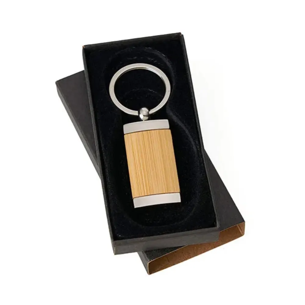 Confeccionado em metal cromado brilhante com detalhe frontal em bambu, possui argola com 3,3cm e está acomodado em uma embalagem interna aveludada e caixa kraft com tampa fechada em cordão elástico preto para presente. Tipo de gravação: Uma gravação a laser no Bambu. Dimensões do produto: 8,5x3x0,5cm Dimensões da embalagem: 120x55x10 mm (AxLxP) Peso da embalagem: 40 g Embalagem do produto: Caixa Preta