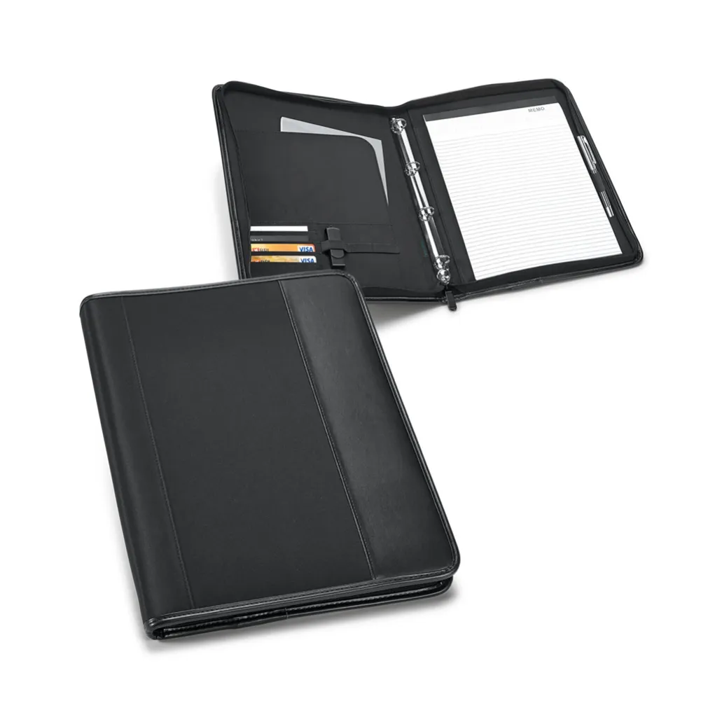 Pasta A4 em c. sintético e microfibra com 4 argolas de 20 mm e caderno com 20 folhas pautadas. Pen drive não inclusa. 265 x 340 x 45 mm