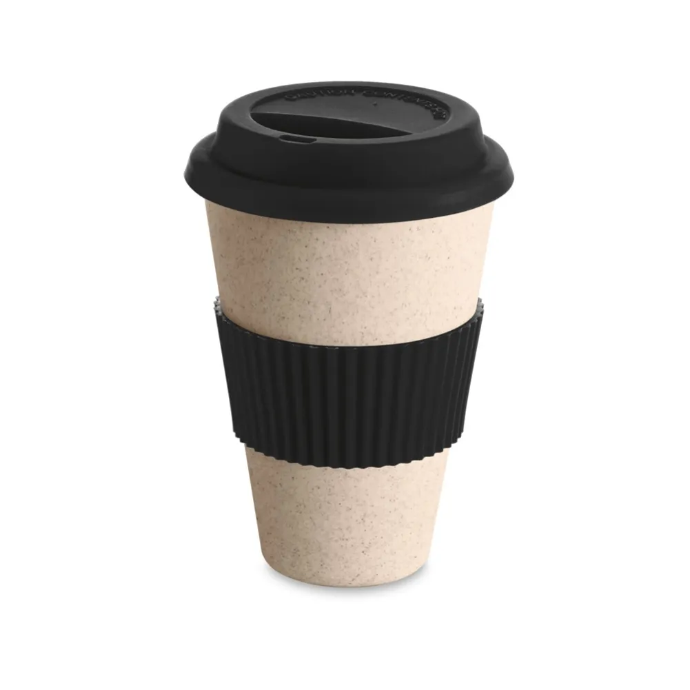 Copo para viagem em fibra de bambu, casca de arroz e melamina. Com tampa e banda de silicone e capacidade até 450 mL. Certificação EU Food Grade. ø96 x 140 mm