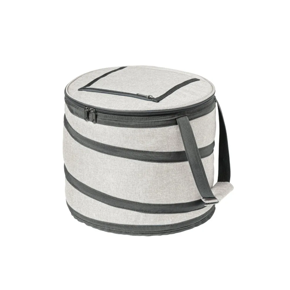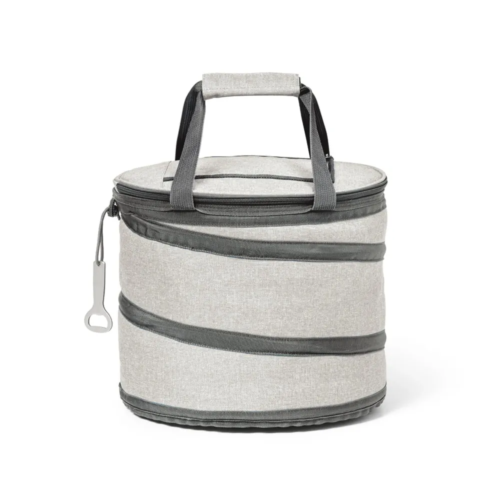 Sacola térmica flexível em 600D com zíper duplo, interior forrado com PEVA e abridor de garrafas. Bolso superior com zíper, alças em webbing, com reforço e capacidade até 15 L. Certificação EU Food Grade. ø300 x 260 mm