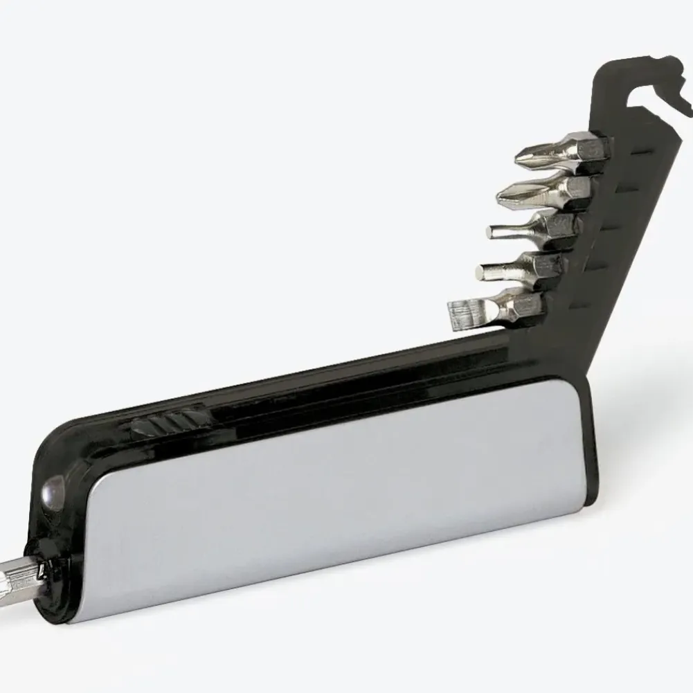 Conjunto de ferramenta em Polipropileno preto/prata. Possui duas chaves de fenda, duas chaves philips, duas chaves allen em tamanhos variados e LED. Tipo de gravação: Uma gravação a Laser. Dimensões do produto: 10x3x1,5cm Dimensões da embalagem: 100x35x20 mm (AxLxP) Peso da embalagem: 73 g Embalagem do produto: Caixa Preta