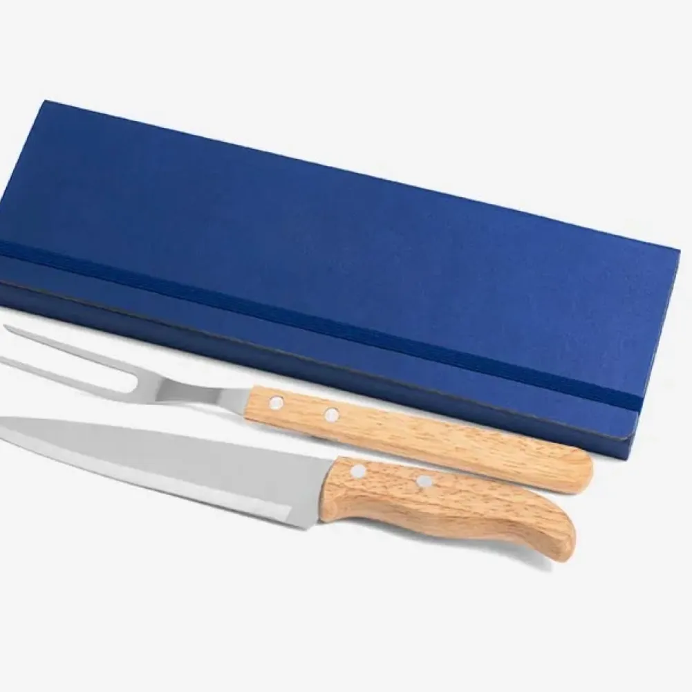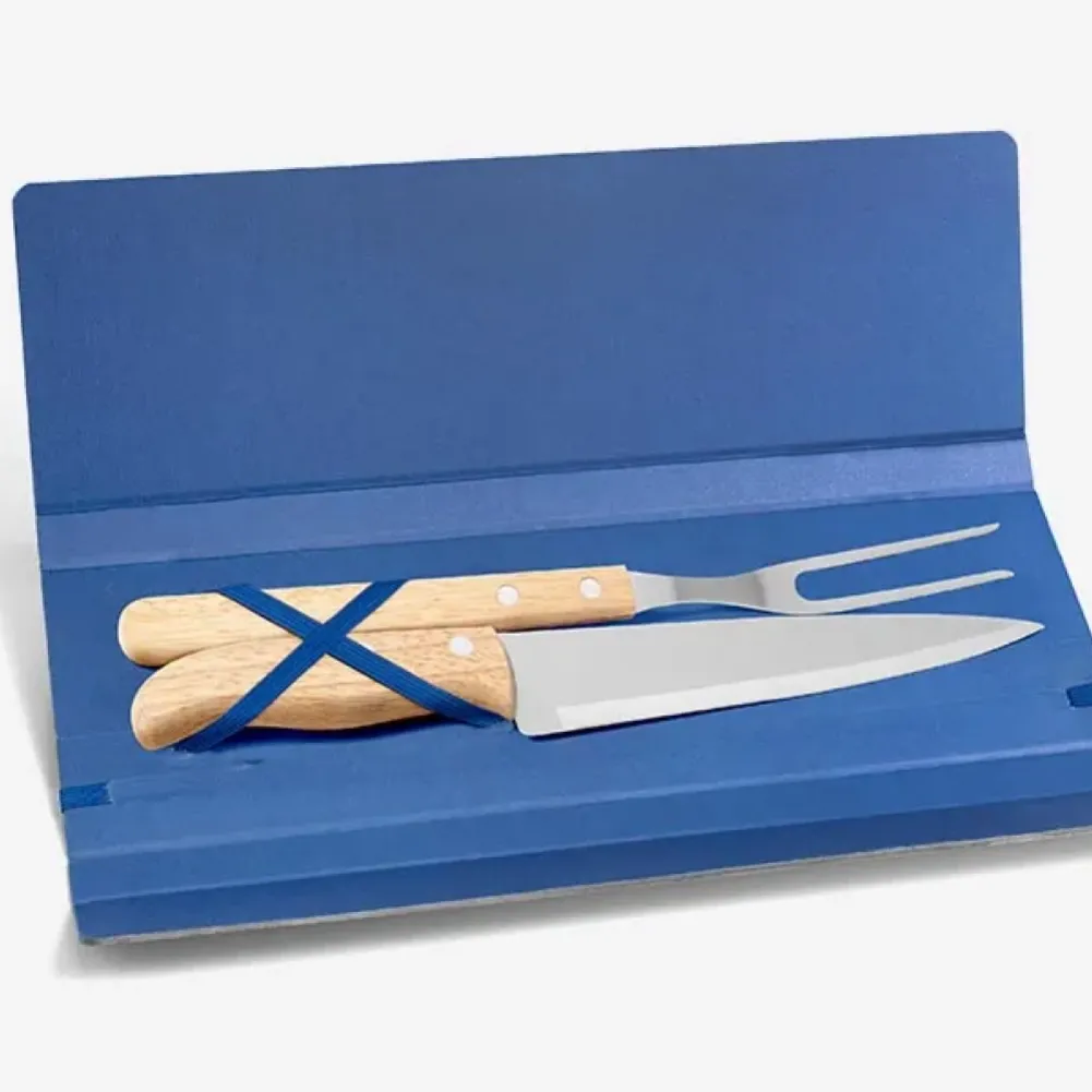 Conjunto composto por uma faca 7” e um garfo trinchante, ambos com cabos em madeira e lâminas em aço Inox. Estão organizados em uma pasta azul com elásticos. Tipo de gravação: Uma gravação em Silkscreen no estojo e uma a Laser na lâmina da faca. Dimensões do produto: Pasta: 33x10x2cm Dimensões da embalagem: 330x100x20 mm (AxLxP) Peso da embalagem: 260 g Embalagem do produto: Plástica