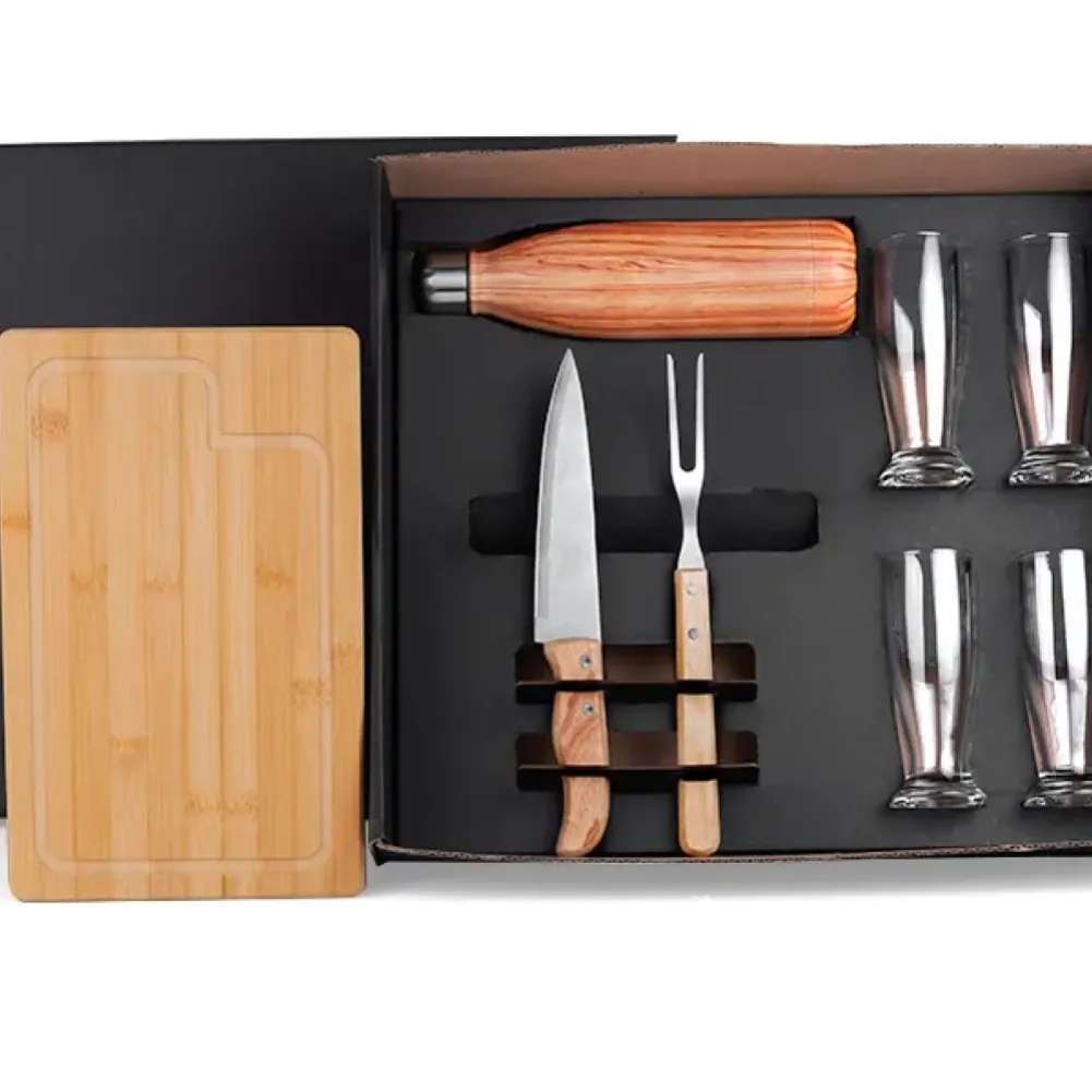 Kit para churrasco. Composto por tábua para churrasco/cozinha em bambu; faca 7" para cozinha e garfo trinchante em madeira/inox; garrafa em aço inox com pintura amadeirada e quatro copos de vidro para cerveja/drinks. Como cortesia, na faca 7" fazemos uma gravação com os cortes do boi. Tipo de gravação: Uma gravação a Laser na tábua e na lâmina da faca. Dimensões do produto: Tábua: 32x20,5x1,2cm Dimensões da embalagem: 465x410x120 mm (AxLxP) Peso da embalagem: 2.065 g Embalagem do produto: Caixa Preta