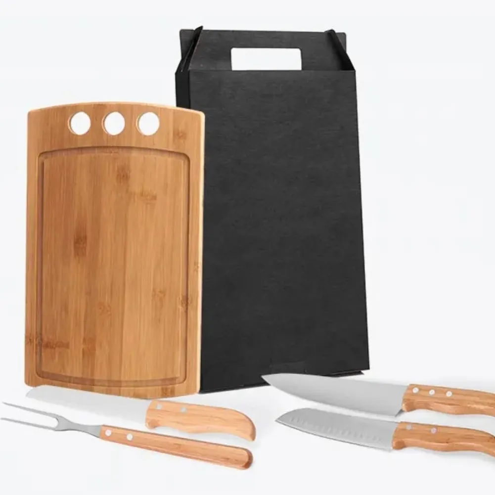 Conjunto composto por uma tábua retangular em tripla camada invertida de Bambu com três furos e sulco, e quatro peças com cabos em Bambu e lâminas em Aço Inox com rebites, sendo uma faca 8”, um garfo trinchante, uma faca Santoku 7” e uma faca 7” para pão. Produto ecológico. Tipo de gravação: Uma gravação a Laser na tábua e na lâmina da faca 8". Dimensões do produto: Tábua: 37x22,5x1,2cm Dimensões da embalagem: 390x240x50 mm (AxLxP) Peso da embalagem: 1.138 g Embalagem do produto: Caixa Preta