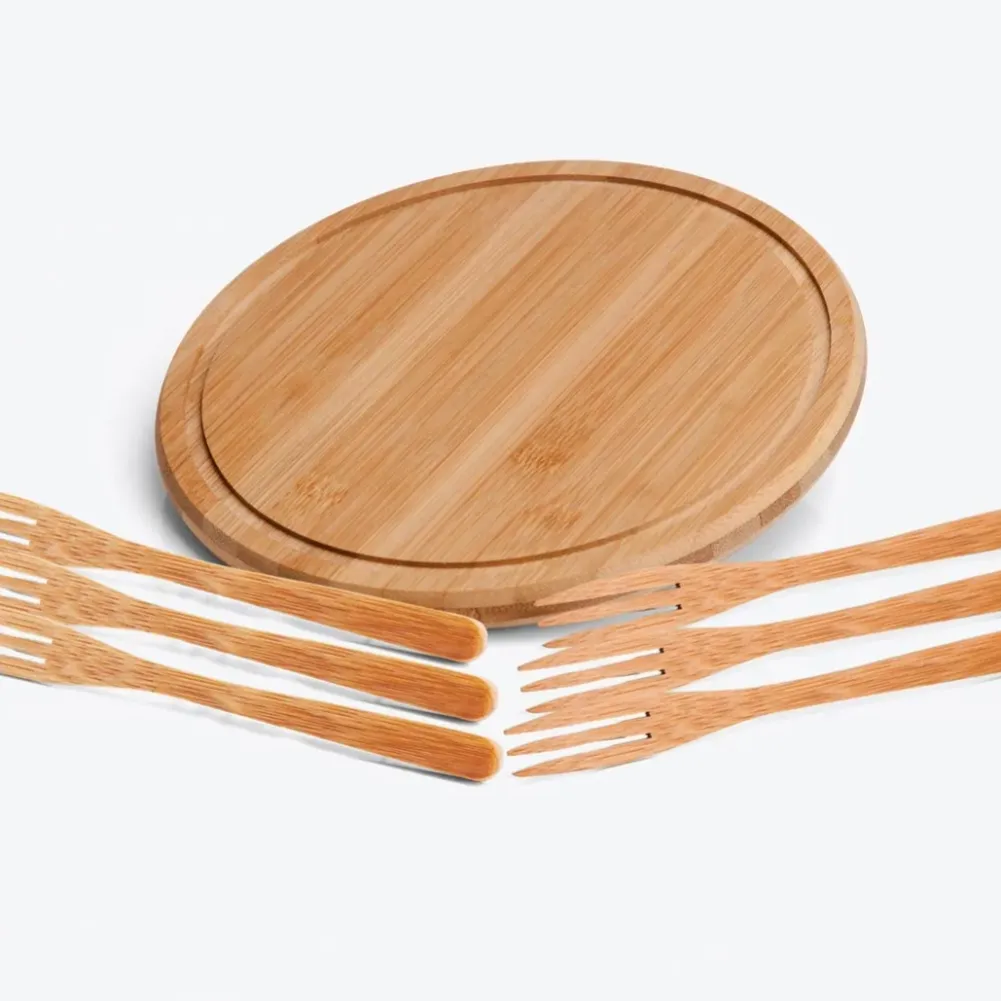 Conjunto composto por uma tábua redonda em tripla camada invertida de bambu, que proporciona maior durabilidade e resistência, com Ø 21cm e seis garfinhos para Petisco/Queijo também confeccionados em bambu. Tipo de gravação: Uma gravação a Laser na tábua. Dimensões do produto: Tábua: 21x1,2cm Dimensões da embalagem: 235x230x45 mm (AxLxP) Peso da embalagem: 385 g Embalagem do produto: Caixa Preta