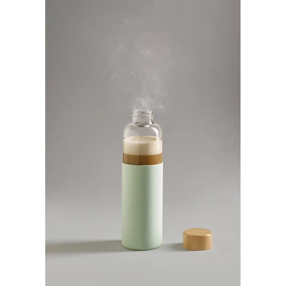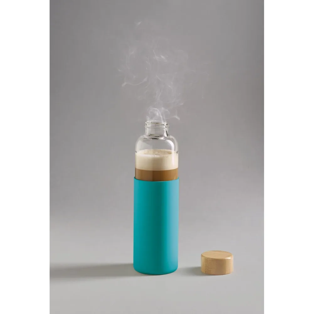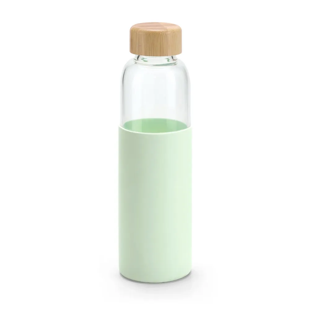 Squeeze em vidro borossilicato e com tampa em bambu. Revestido com luva em silicone. Capacidade até 600 mL. Certificação EU Food Grade. Fornecido em caixa. ø68 x 231 mm
