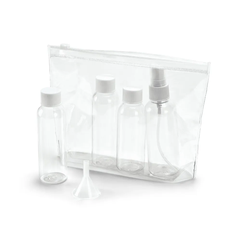 Bolsa de cosméticos hermética em PVC. Incluso 3 frascos (2 x 65 mL e 60 mL), 1 vaporizador (80 mL) e 1 funil. Apropriada para transporte em cabine de avião. 190 x 155 x 40 mm