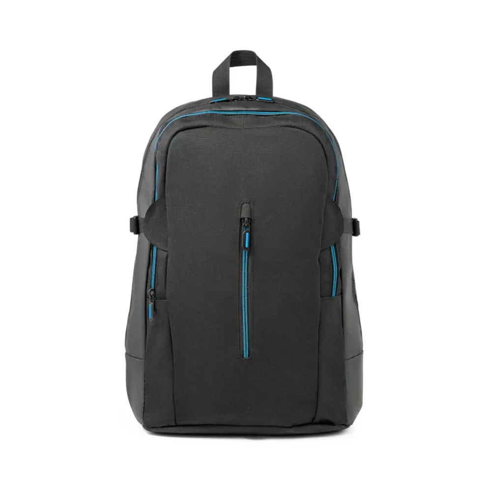 Mochila para notebook em 900D e c. sintético com 2 compartimentos principais e bolso frontal. O compartimento posterior é forrado e tem divisória almofadada para notebook até 15.6" e bolso em tela, com zípper. O compartimento médio também é forrado e contém diversos bolsos interiores. A parte posterior e alças são almofadadas. 330 x 450 x 160 mm