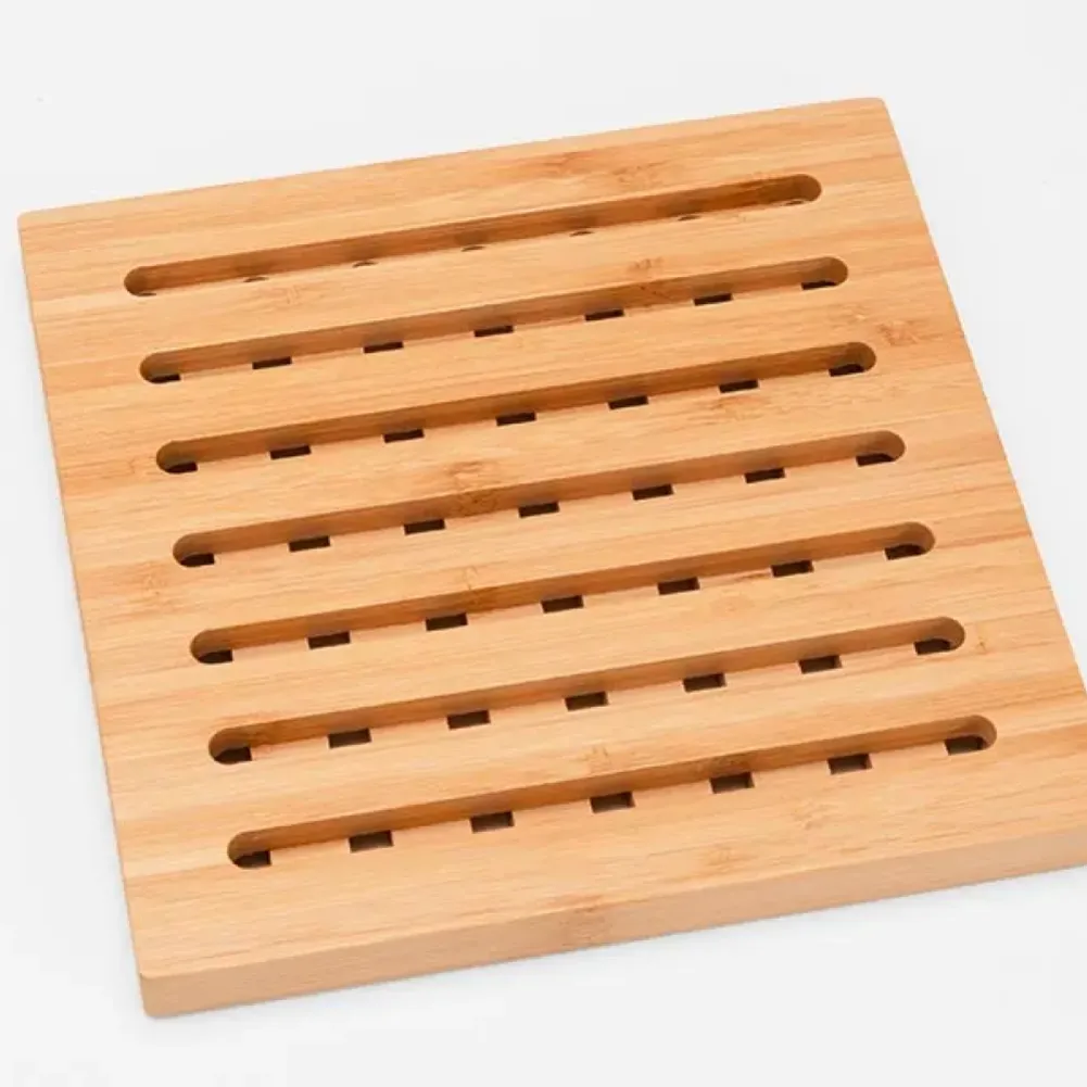 Descansa prato quadrado em bambu. Tipo de gravação: Uma gravação a Laser. Dimensões do produto: 18x18x1,5cm Dimensões da embalagem: 180x180x15 mm (AxLxP) Peso da embalagem: 325 g Embalagem do produto: Plástica
