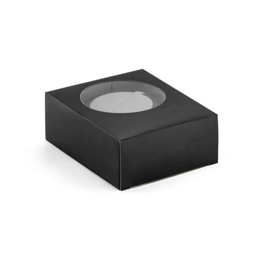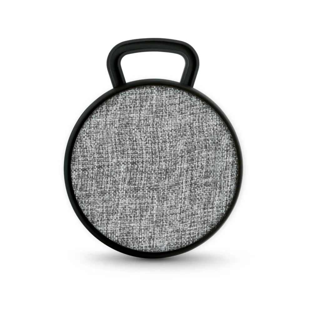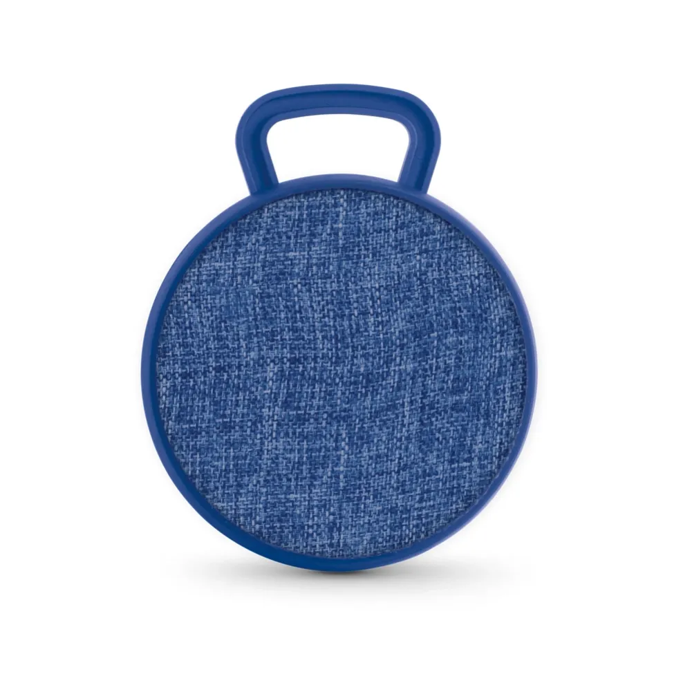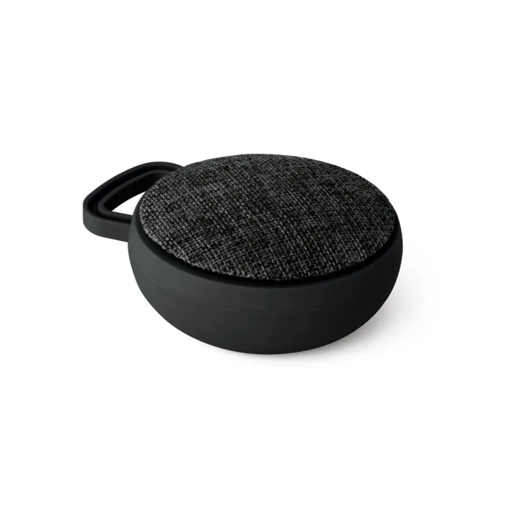 Caixa de som com microfone em ABS e tecido em poliéster. Com gancho e acabamento emborrachado. transmissão sem fios BT v42, potência de 3W/4Ω e autonomia aproximada de 3 h. Função para atender chamadas, controle de volume e conexão à playlist do dispositivo móvel. Incluso cabo para carregamento. Fornecida em caixa presente. ø90 x 40 mm | Caixa: 115 x 95 x 45 mm