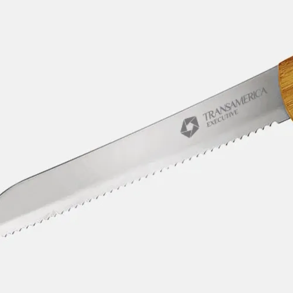 Faca para pão em Bambu/Inox 7". Rebites em Aço Inox 304, um dos mais resistentes à ferrugem e corrosão. Tipo de gravação: Uma gravação a Laser. Dimensões do produto: 30cm Dimensões da embalagem: 300x30x20 mm (AxLxP) Peso da embalagem: 73 g Embalagem do produto: Sem embalagem