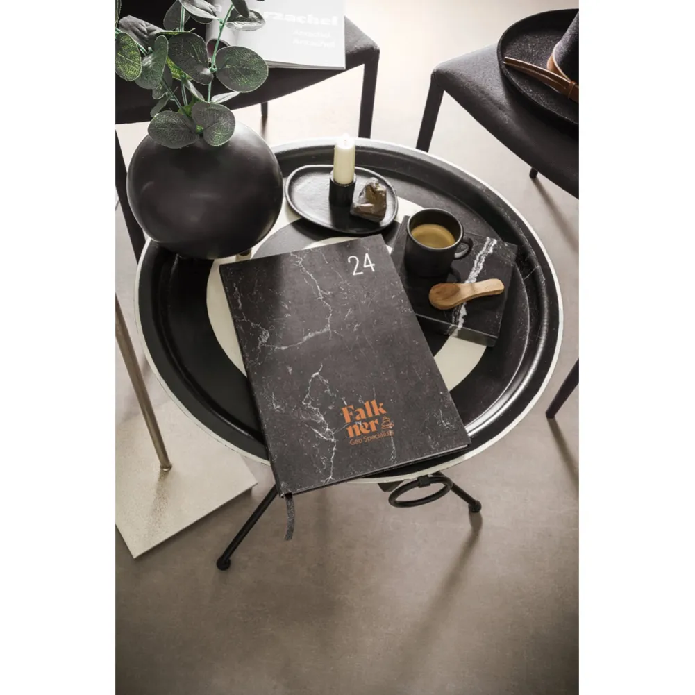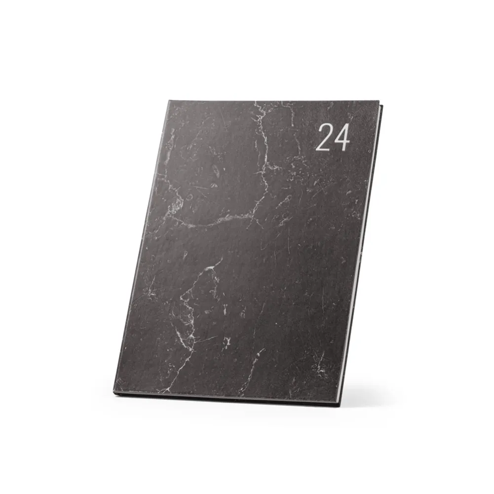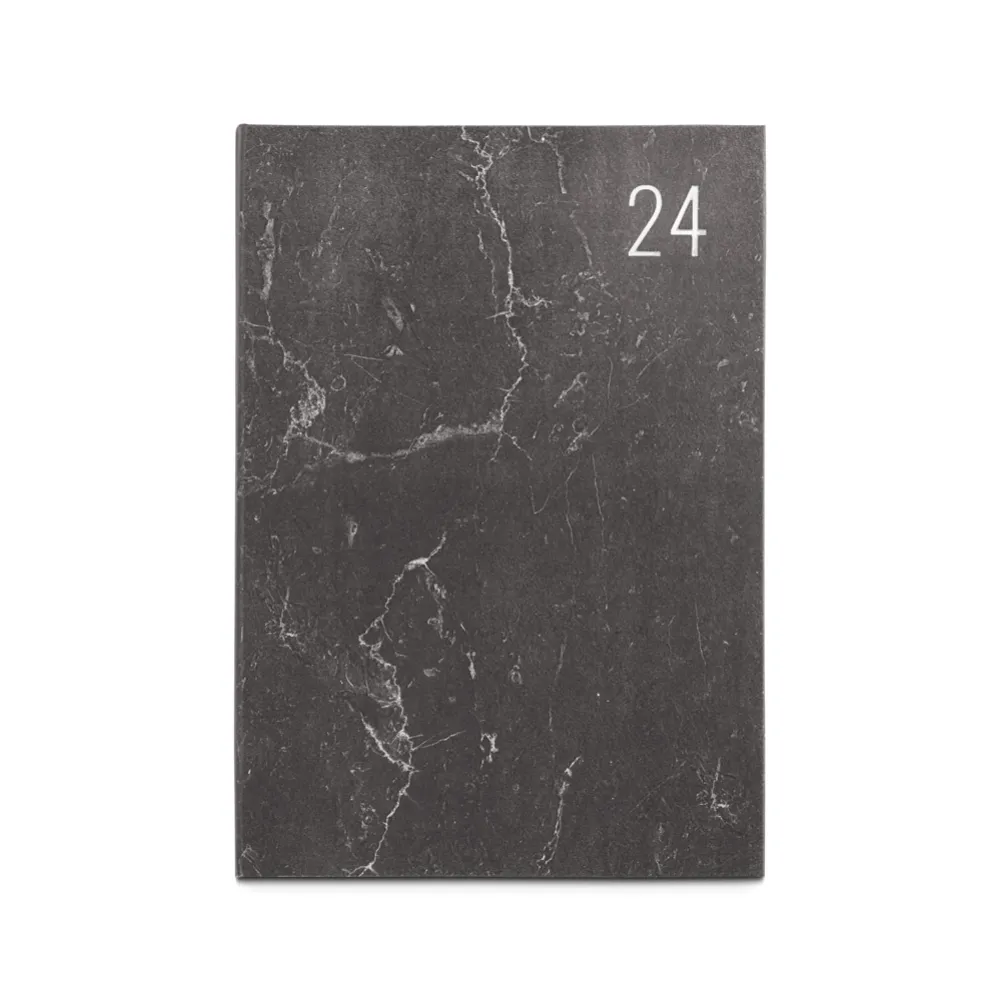 Agenda B5 com capa rígida em papel pedra e marcador em fita, com aspeto mármore e cantos retos. Está organizada num plano semanal. 175 x 245 mm