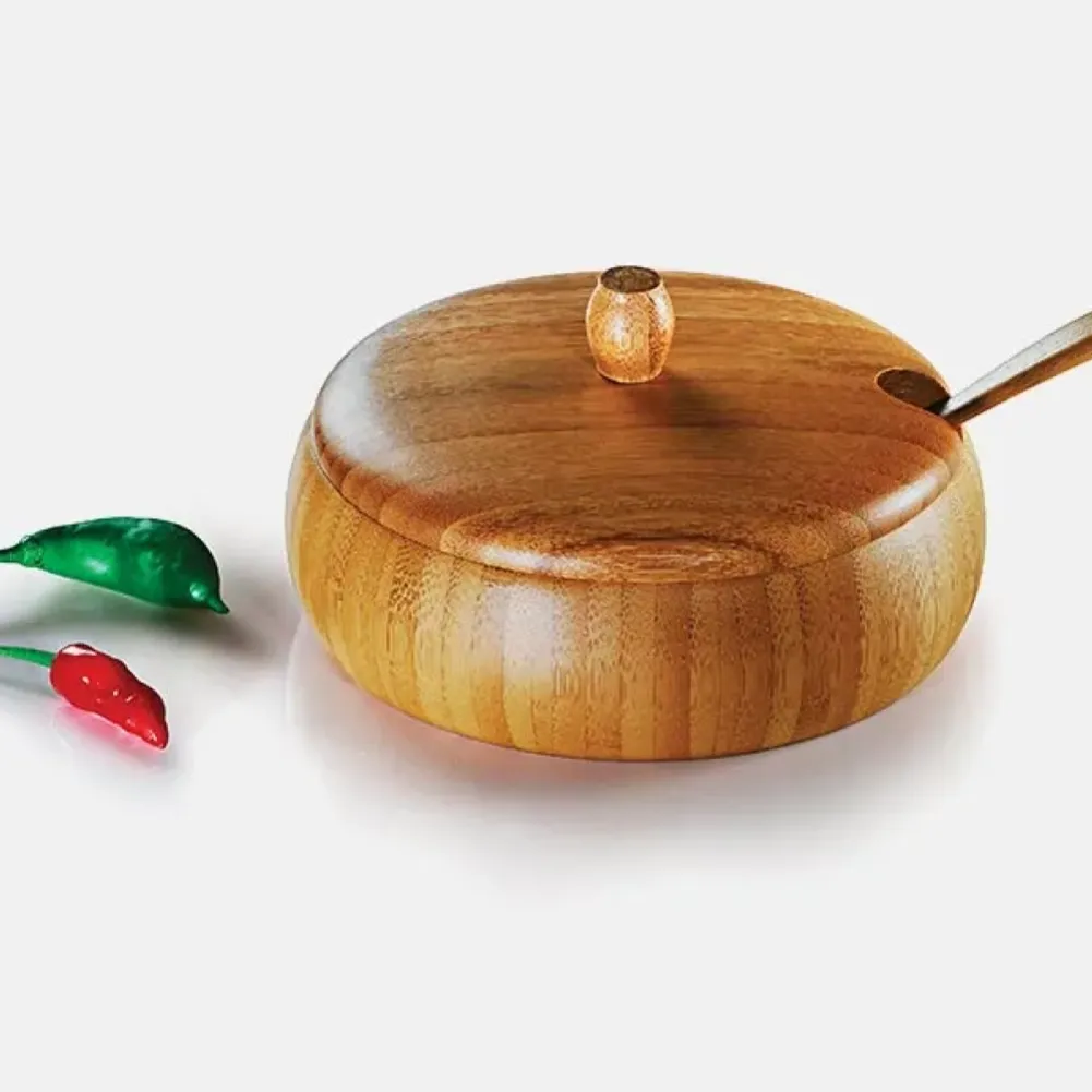 Farinheira em bambu. Conta com cumbuca, tampa e colher. Tipo de gravação: Uma gravação a Laser na tampa. Dimensões do produto: 15x8cm Dimensões da embalagem: 160x160x100 mm (AxLxP) Peso da embalagem: 400 g Embalagem do produto: Caixa Kraft