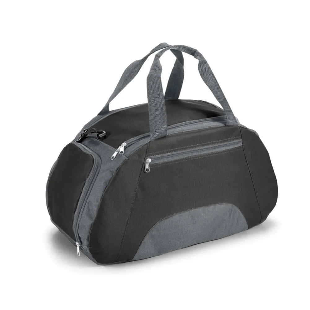 Bolsa esportiva em 600D com divisória interior e fundo com placa semi-rígida. Bolso frontal e bolso lateral para calçado, ambos com zíper. Alça de ombro ajustável. 520 x 300 x 255 mm
