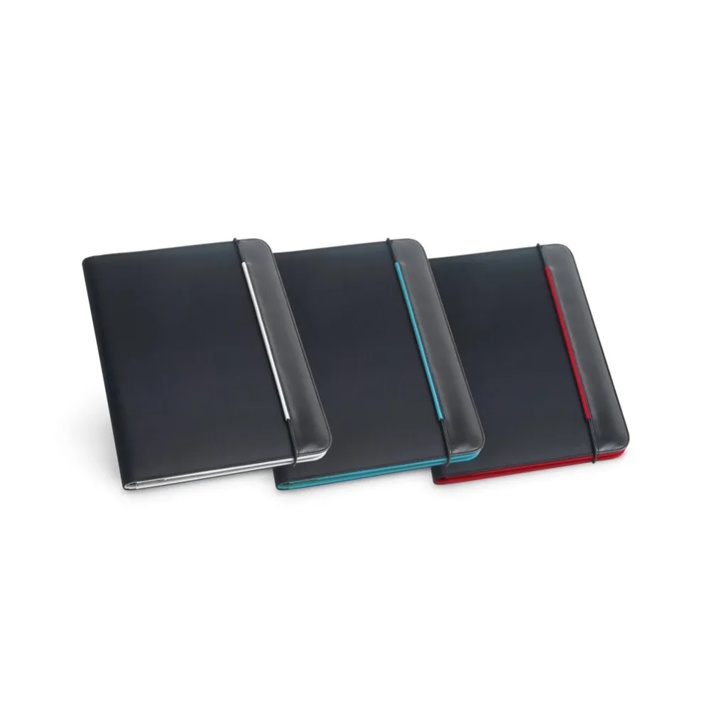 Pasta A4 em c. sintético e 800D com o interior em microfibra. A pasta contém um elástico para fechar e no seu interior inclui um bloco de 20 folhas pautadas, 3 bolsos e suporte para esferográfica (não inclusa). 245 x 315 x 15 mm