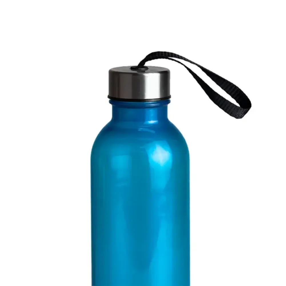 Garrafa azul em PET. Conta com tampa rosqueável em Aço Inox com cordão. Livre de BPA. Capacidade: 600ml Tipo de gravação: Uma gravação em Silkscreen. Dimensões do produto: Capacidade: 600ml Dimensões da embalagem: 230x65x0 mm (AxLxP) Peso da embalagem: 102 g Embalagem do produto: Plástica