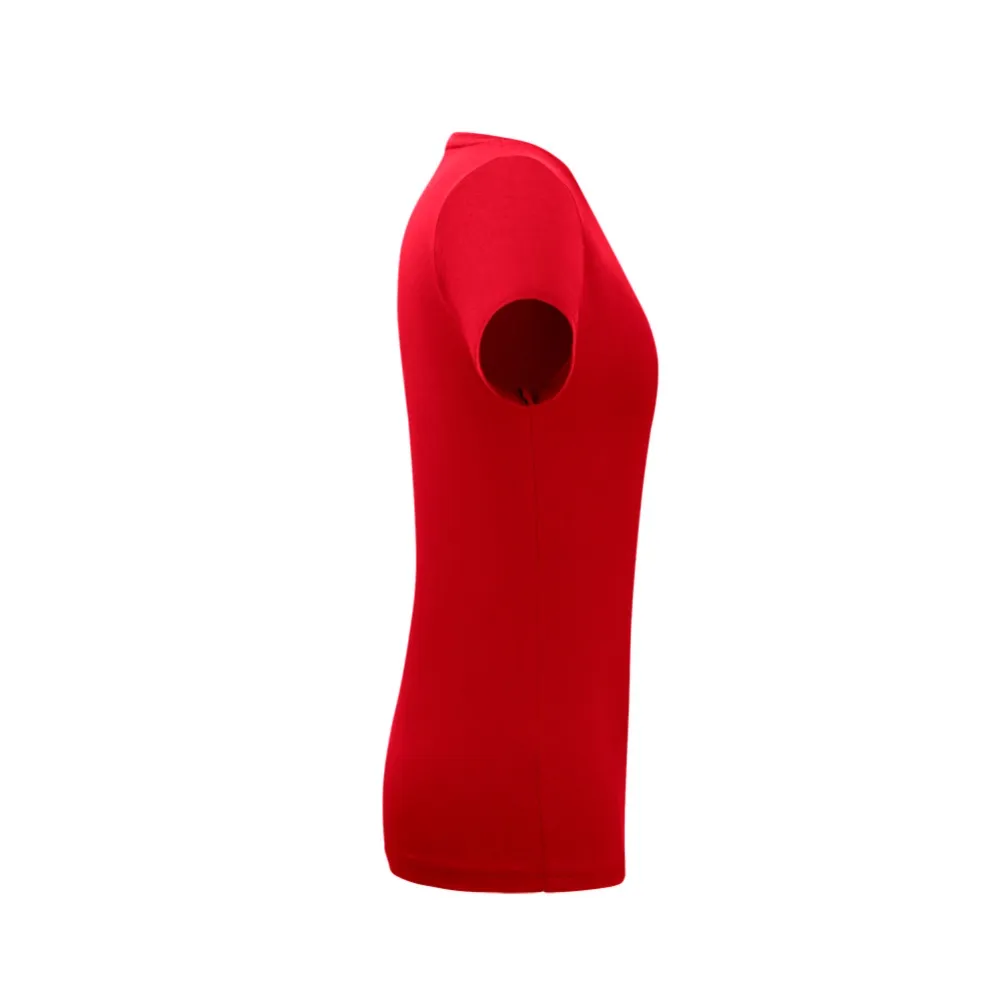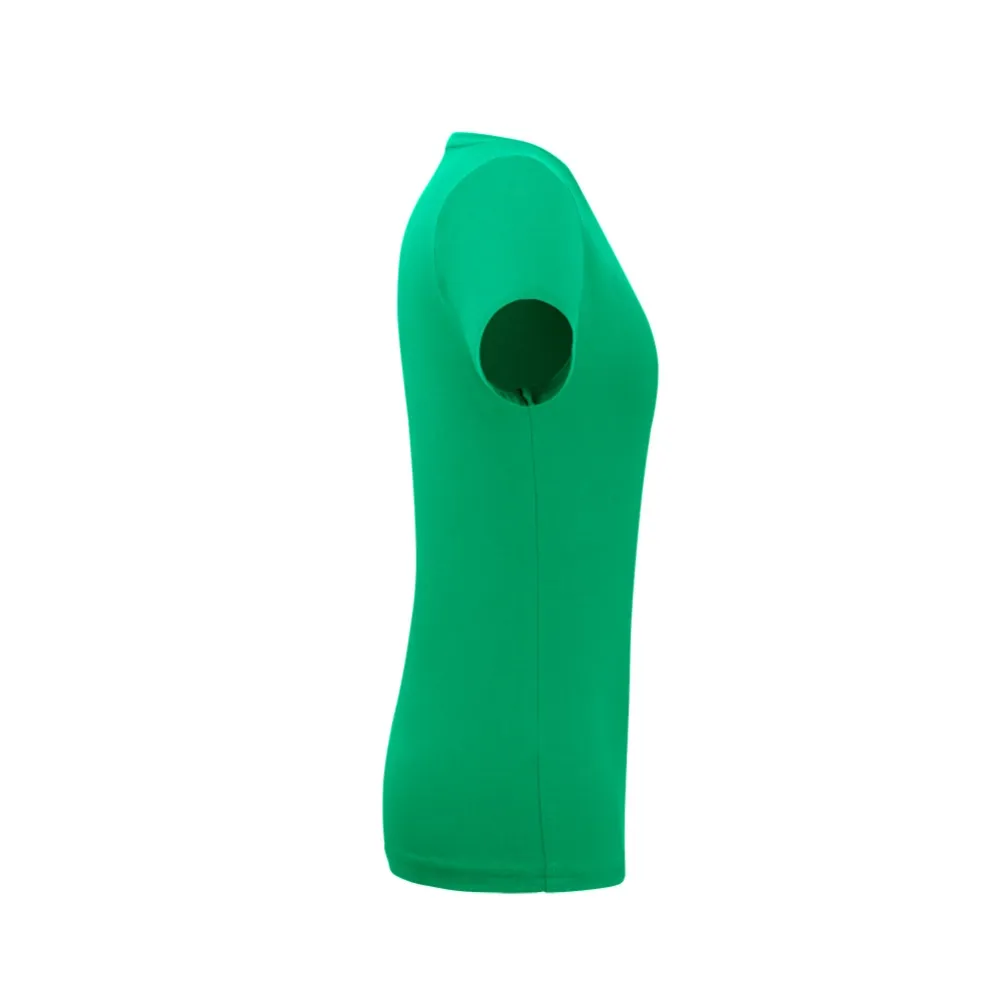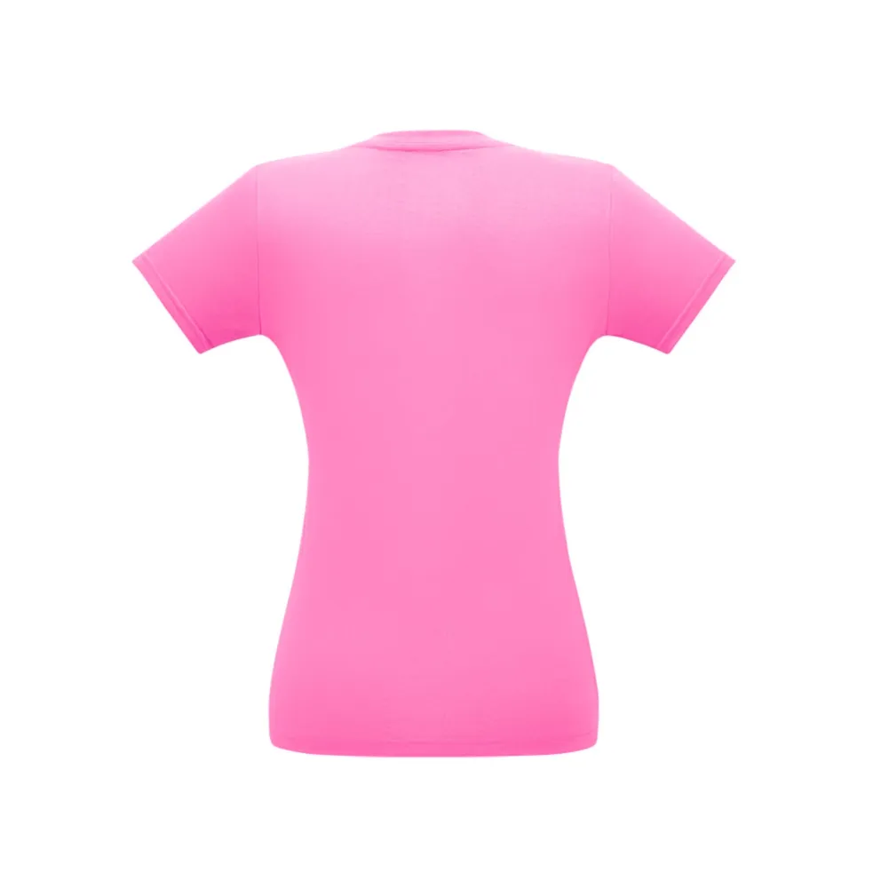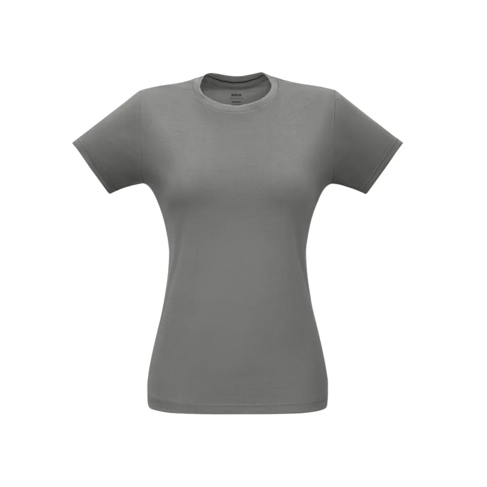 Camiseta feminina de corte cinturado em malha 100% algodão (135 g/m2) com fio 30/1 misto. Com gola em ribana 1x1 com fita de reforço e com costura dupla nas mangas, barra de fundo e laterais. Tamanhos: P, M, G, GG