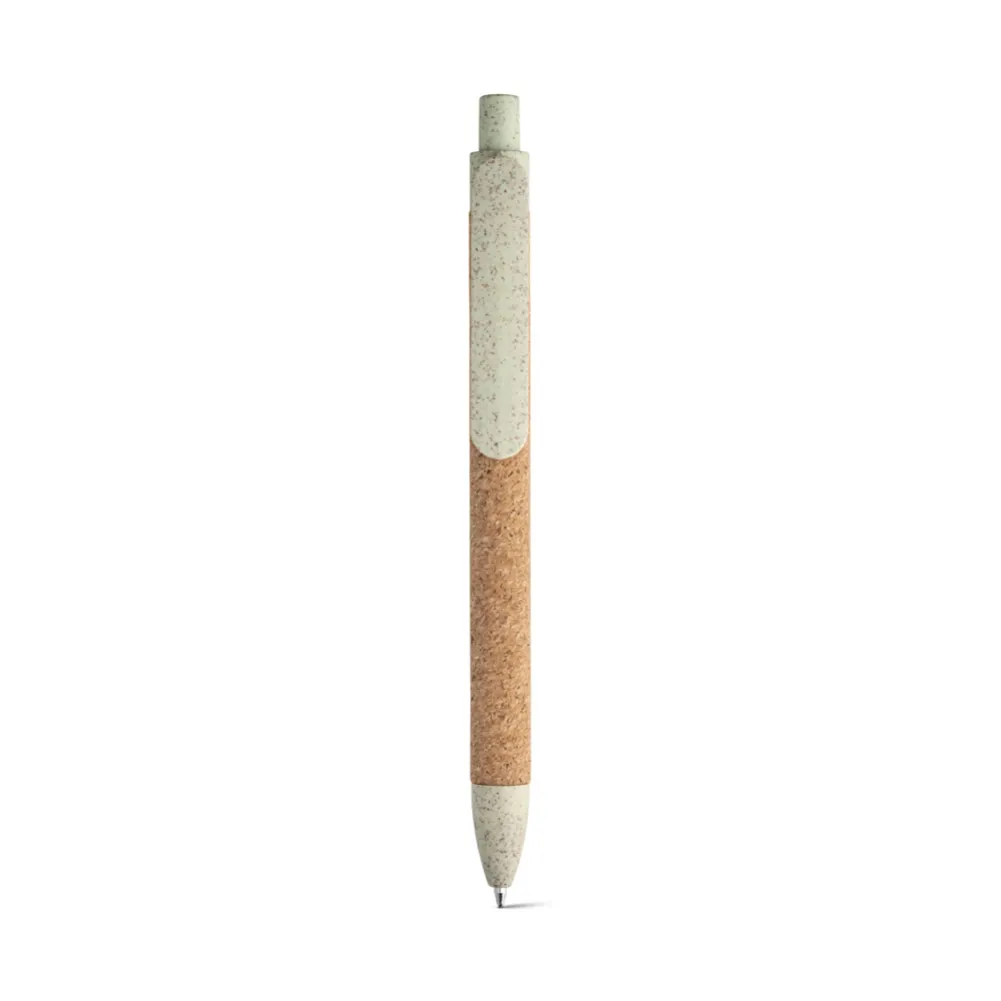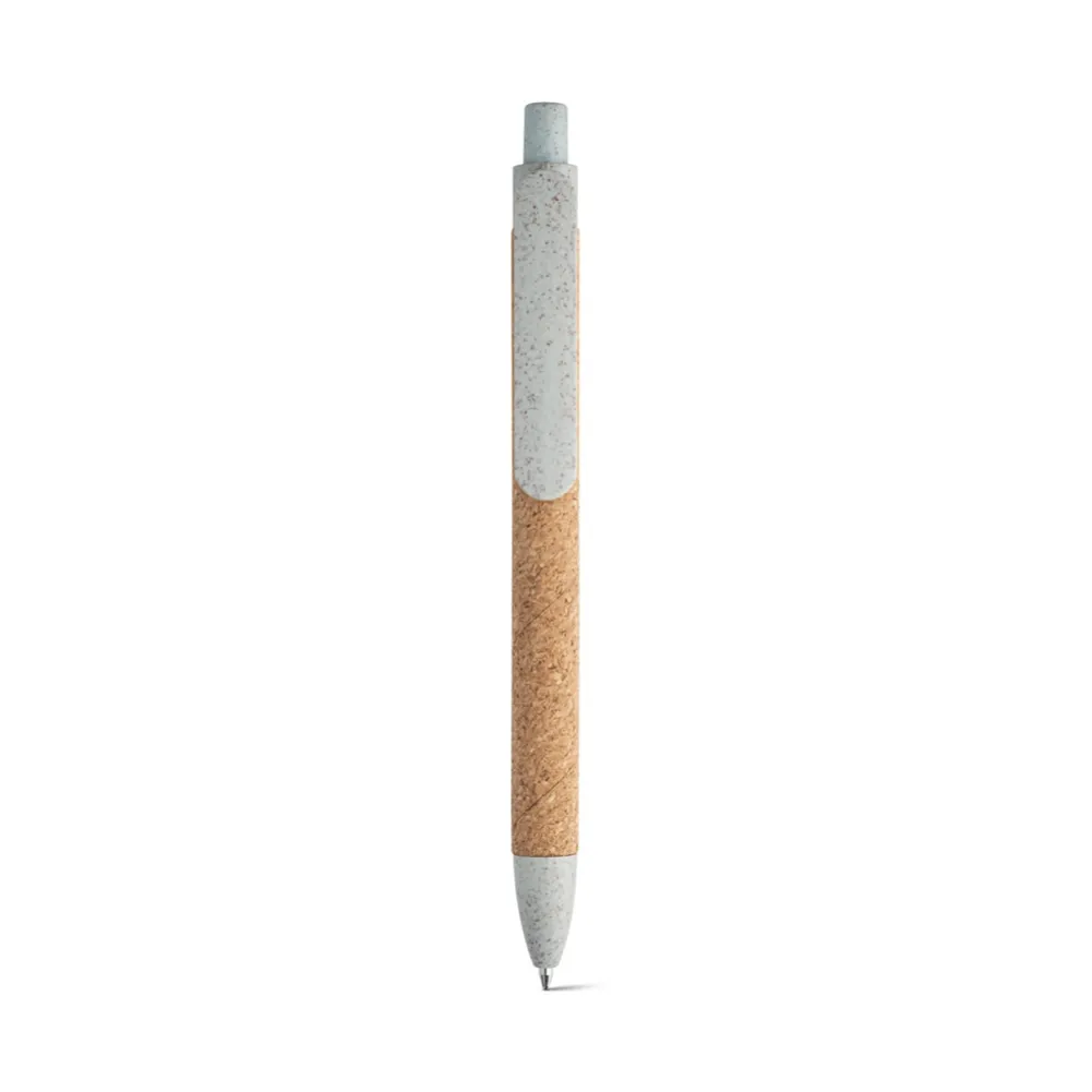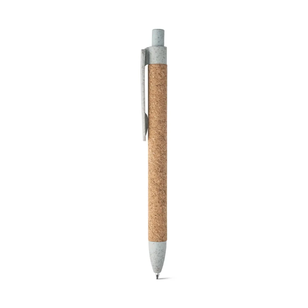 Esferográfica em cortiça com clipe e elementos coloridos em fibra de trigo e PP. Escrita a azul. ø11 x 140 mm