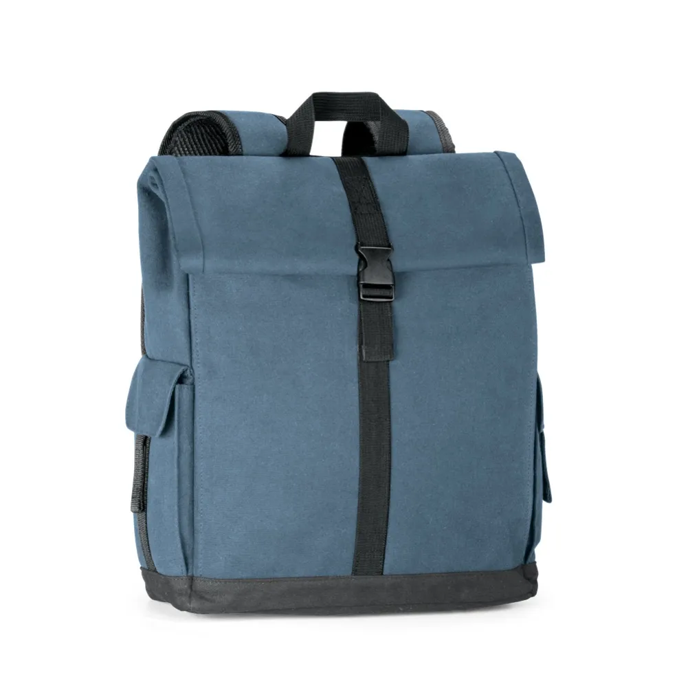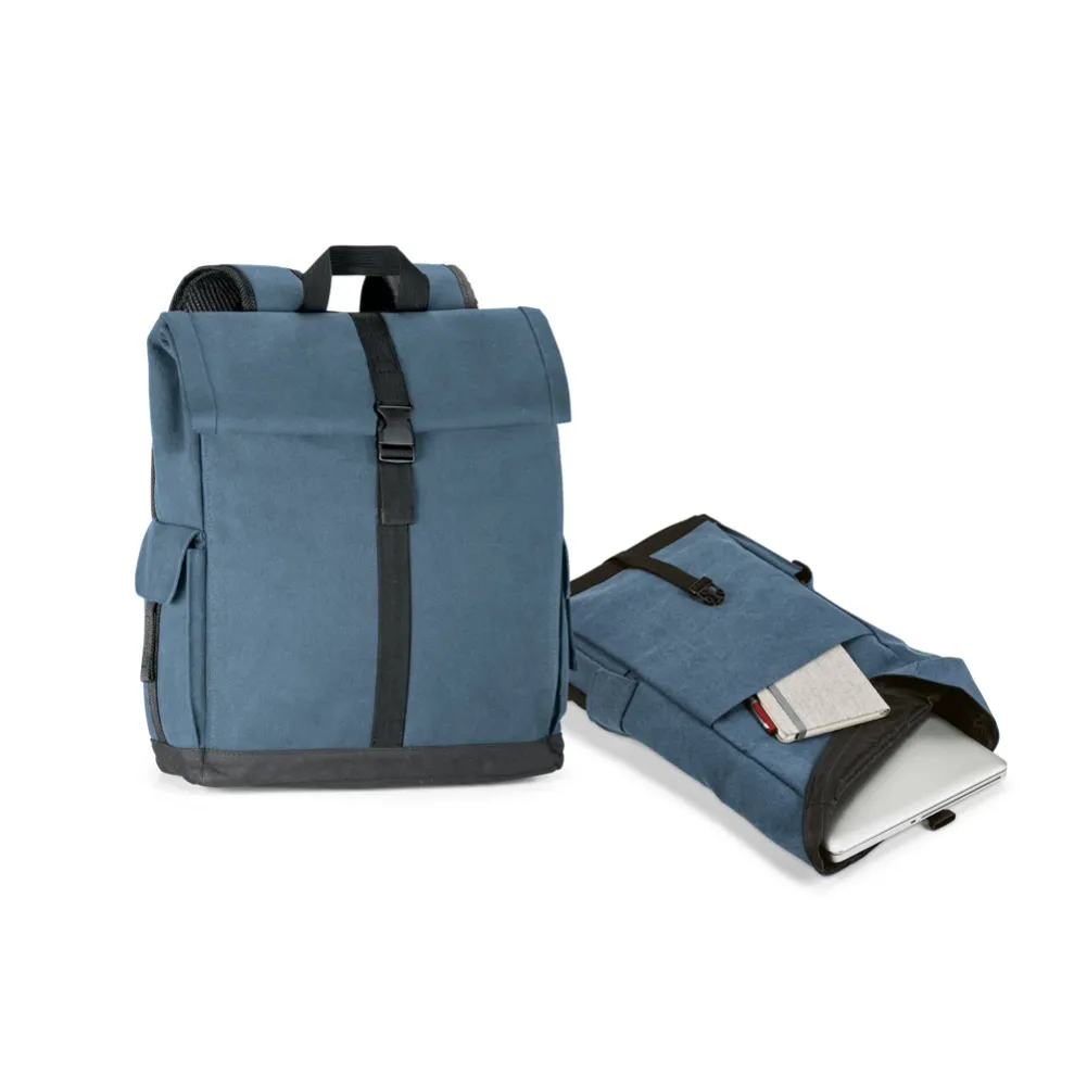 Mochila para notebook em algodão canvas pré-lavado. Compartimento principal forrado, com 2 bolsos interiores e divisória almofadada para notebook até 156". Bolso frontal e 2 bolsos laterais. Parte posterior e alças almofadadas. 300 x 390 x 120 mm