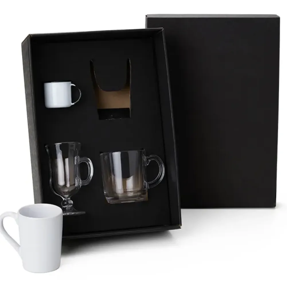Conta com caneca em vidro com capacidade de 300ml, caneca de vidro p/ café com capacidade de 130ml, caneca em cerâmica branca com capacidade de 230 ml e caneca em alumínio branca. Tipo de gravação: Gravação a Laser nas canecas de vidro e alumínio; Gravação em Silkscreen na caneca de cerâmica. Dimensões do produto: Caneca Cerâmica Branca: 230 ml Dimensões da embalagem: 353x242x95 mm (AxLxP) Peso da embalagem: 1.080 g Embalagem do produto: Caixa Preta