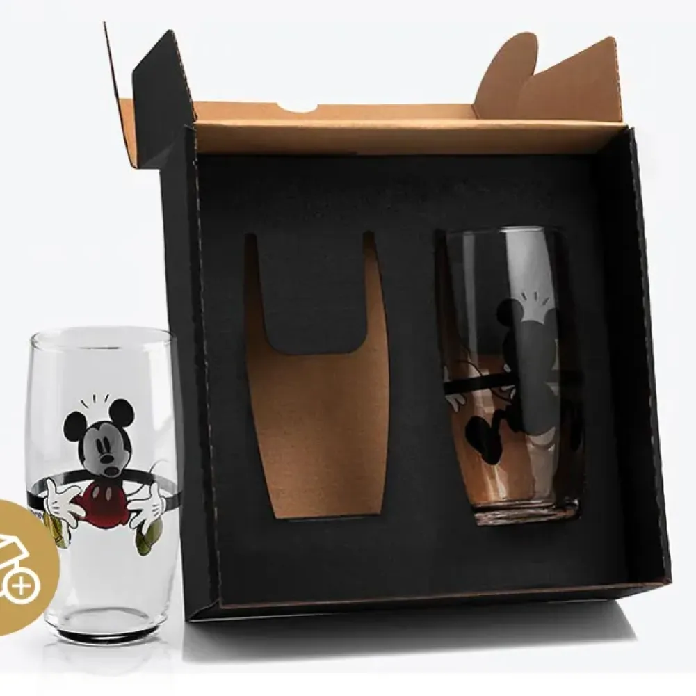 Jogo de copos personalizados contendo dois copos Mickey em vidro e embalagem. Tipo de gravação: Uma gravação a Laser na tampa da caixa. Dimensões do produto: 300ml cada Dimensões da embalagem: 230x230x90 mm (AxLxP) Peso da embalagem: 435 g Embalagem do produto: Caixa Preta