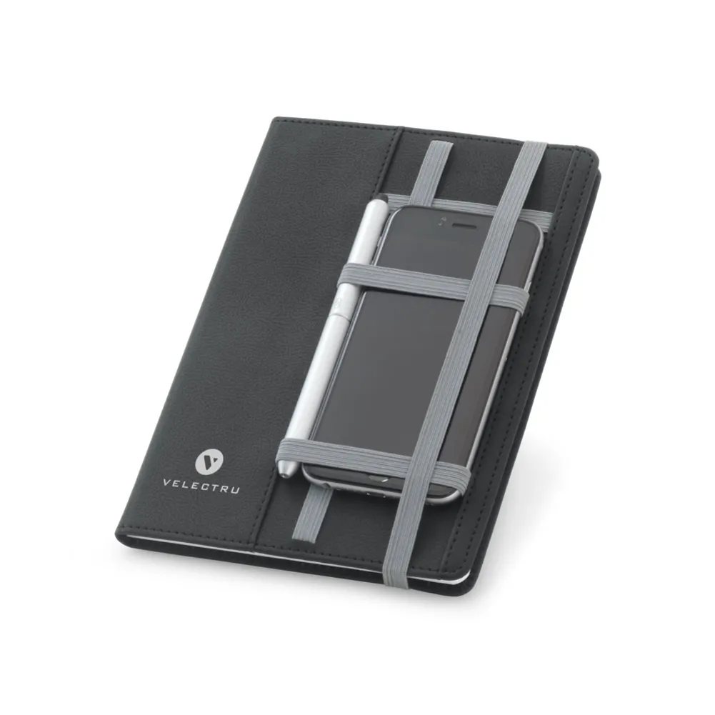 Caderno A5 em c. sintético, capa dura e 80 folhas lisas. Contém elásticos com capacidade para suportar esferográfica (não inclusa), celular e cartões e um elástico para fechar o bloco de notas. Fornecido em bolsa de non-woven. 150 x 210 mm | Bolsa: 185 x 240 mm