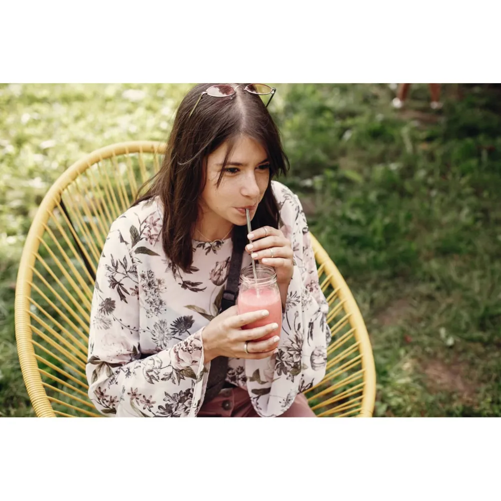 Canudo em aço inox. Certificação EU Food Grade. Embalagem vendida opcionalmente: 92918 (bolsa em now-woven) ou 92917 (bolsa em linho). Canudo: Ø6 x 215 mm | Escova de limpeza: 240 mm
