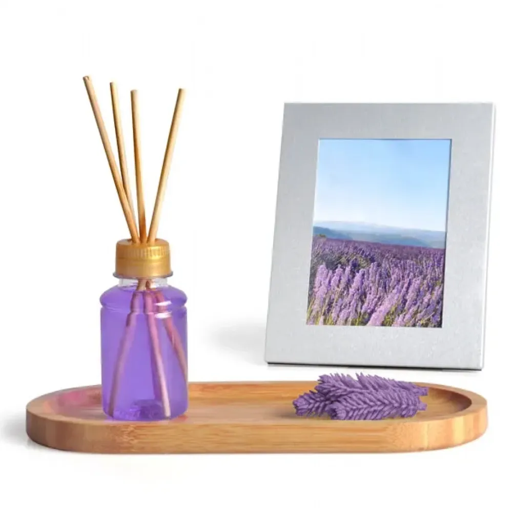 Kit bandeja, aromatizador e acessórios. Composto por bandeja oval em bambu; garrafa transparente em PET; porta-retrato em alumínio; aromatizador de ambiente com fragrância de lavanda. Tipo de gravação: Uma gravação a Laser na bandeja e no porta-retrato; gravação em Silk Screen na garrafa e na tampa da caixa. Dimensões do produto: Bandeja: 26x12x1,7cm Dimensões da embalagem: 395x347x120 mm (AxLxP) Peso da embalagem: 980 g Embalagem do produto: Caixa Preta