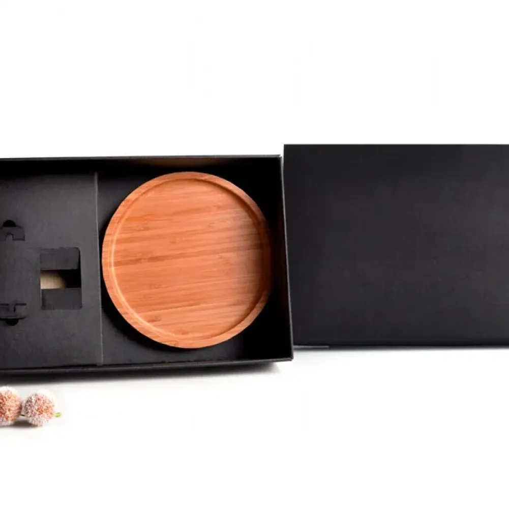 Kit para bandeja e aromatizador. Conta com bandeja redonda em bambu e aromatizador de ambiente com fragrância de cereja e avelã. Tipo de gravação: Uma gravação a Laser na bandeja e Silk Screen na tampa da caixa. Dimensões do produto: Bandeja: 20x1,9cm Dimensões da embalagem: 353x242x95 mm (AxLxP) Peso da embalagem: 640 g Embalagem do produto: Caixa Preta