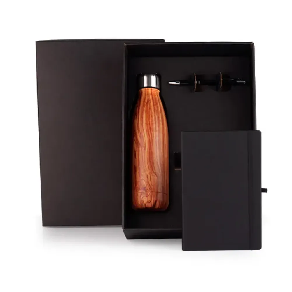 Kit de boas vindas. Composto por garrafa em aço Inox com pintura amadeirada; caderno para anotações preto com capa dura e caneta esferográfica em alumínio preta. Tipo de gravação: Uma gravação a Laser na garrafa. Dimensões do produto: Caderno: 14x21 cm Dimensões da embalagem: 353x242x95 mm (AxLxP) Peso da embalagem: 720 g Embalagem do produto: Caixa Preta